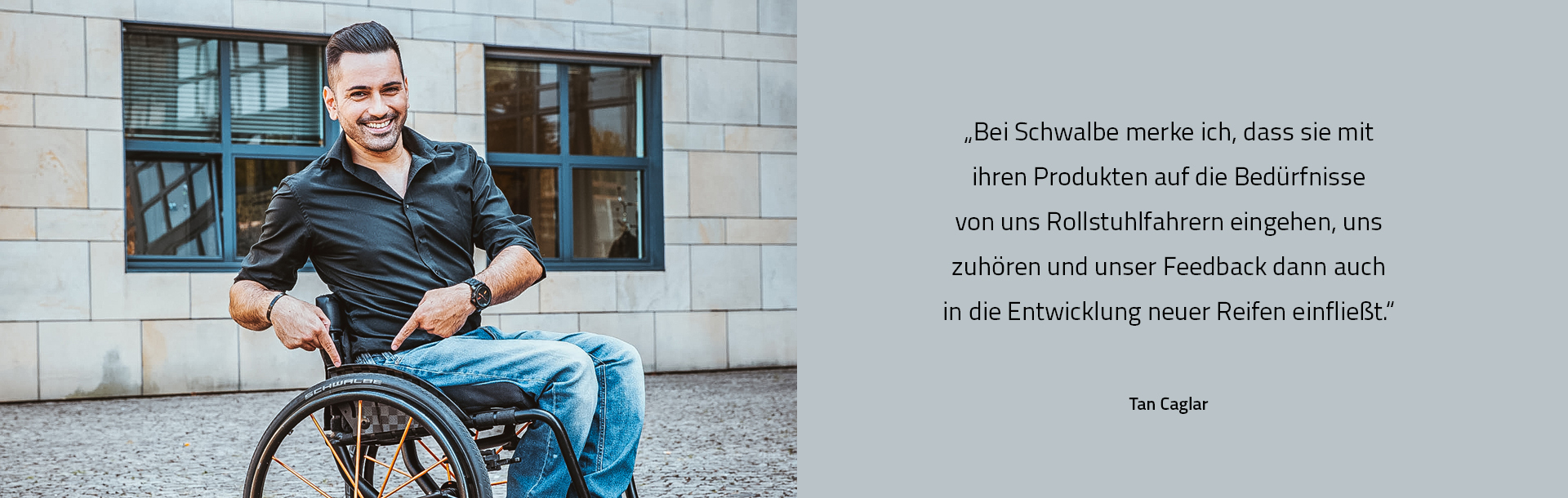 Ich bin jemand, der sehr abhängig ist von seiner Mobilität und seiner Bewegung. Alles, was ich mache, mache ich in meinem Rollstuhl. Deshalb ist es für mich jetzt auch wichtig, zu zeigen, dass es die Zusammenarbeit mit meiner Persönlichkeit verbunden und authentisch ist. Bei Schwalbe merke ich, dass sie mit ihren Produkten auf die Bedürfnisse von uns Rollstuhlfahrern eingehen, uns zuhören und unser Feedback dann auch in die Entwicklung neuer Reifen einfließt.