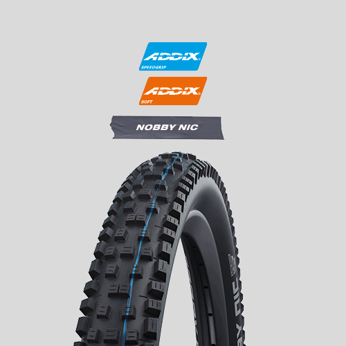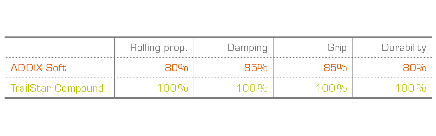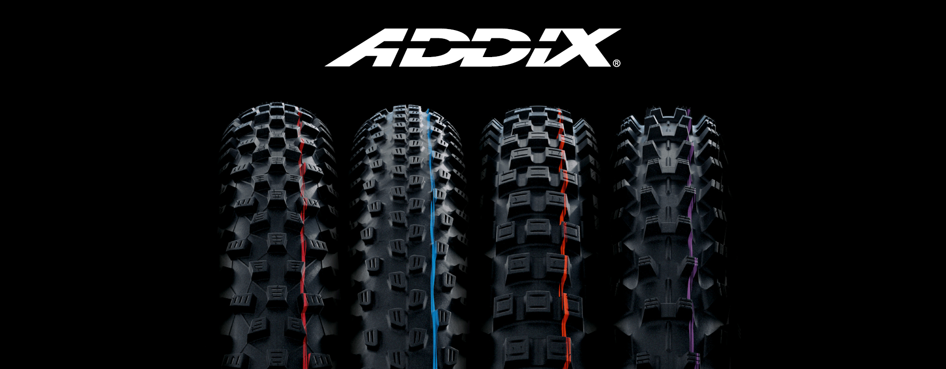 Rollt klasse und begeistert durch gute Dämpfung. Das ist ADDIX Soft. Wir haben tief in die Reifenbauer-Trickkiste gegriffen, um beides optimal abzustimmen. Herausgekommen ist ein Compound, das unglaublich viel Spaß macht. Tipp: ADDIX soft ist auch ideal fürs E-MTB. Da spielt es seine Stärken „viel Dämpfung und satter Grip“ voll aus, und das wegen der optimierten Kälteeigenschaften das ganze Jahr über!