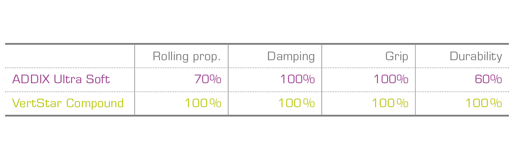 ADDIX entsteht nach komplett neuen Rezepturen. Wir kaufen dafür weltweit zielgenau ausgesuchte und modernste Rohstoffe in sorgfältig geprüfter Qualität. Grundsätzlich haben wir die Füllgrade für Silica markant erhöht und wir steuern das Mischverfahren exakter als je zuvor. Deshalb zeichnen sich ADDIX Compounds durch eines ganz besonders aus: Sie lösen den Zielkonflikt Grip-Rollwiderstand-Verschleiß in einer viel größeren Bandbreite.