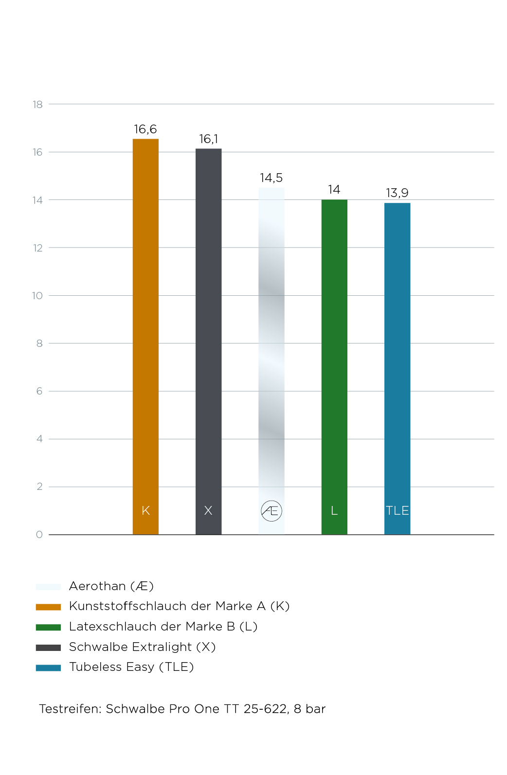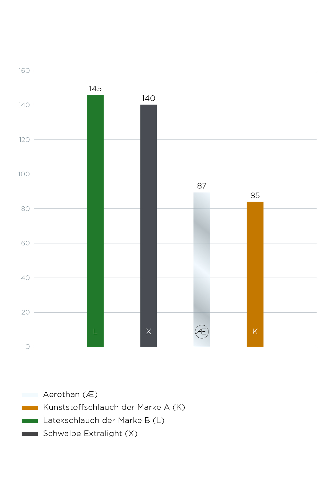 Der Rollwiderstand mit Aerothan Tube liegt in etwa gleichauf mit dem des Latexschlauchs. Allerdings bei deutlich geringerem Gewicht