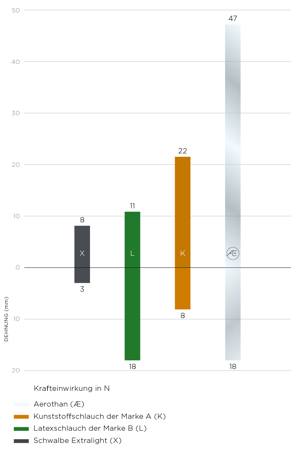 Der Aerothan Tube ist allen anderen Schläuchen im Test bei der Krafteinwirkung mit 47 N überlegen und im Dehnverhalten mit 18 mm gleichauf mit einem Schlauch aus Latex.