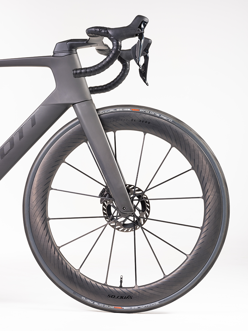 Der Pro One Aero ist aus einer Kooperation mit Scott, Syncros und dem Schweizer Ingenieursbüro Radiate entstanden. Wichtiger Bestandteil des Projekts: Den bestmöglichen aerodynamische Reifen zu entwickeln, der keine Abstriche in der Fahrperformance macht. Im Windkanal haben Schwalbes Entwickler die Reifenform für moderne, breite Felgen (Maulweiten ab 21mm) optimiert. Für Vorder- und Hinterrad werden dabei verschiedene Konstruktionen verwendet.