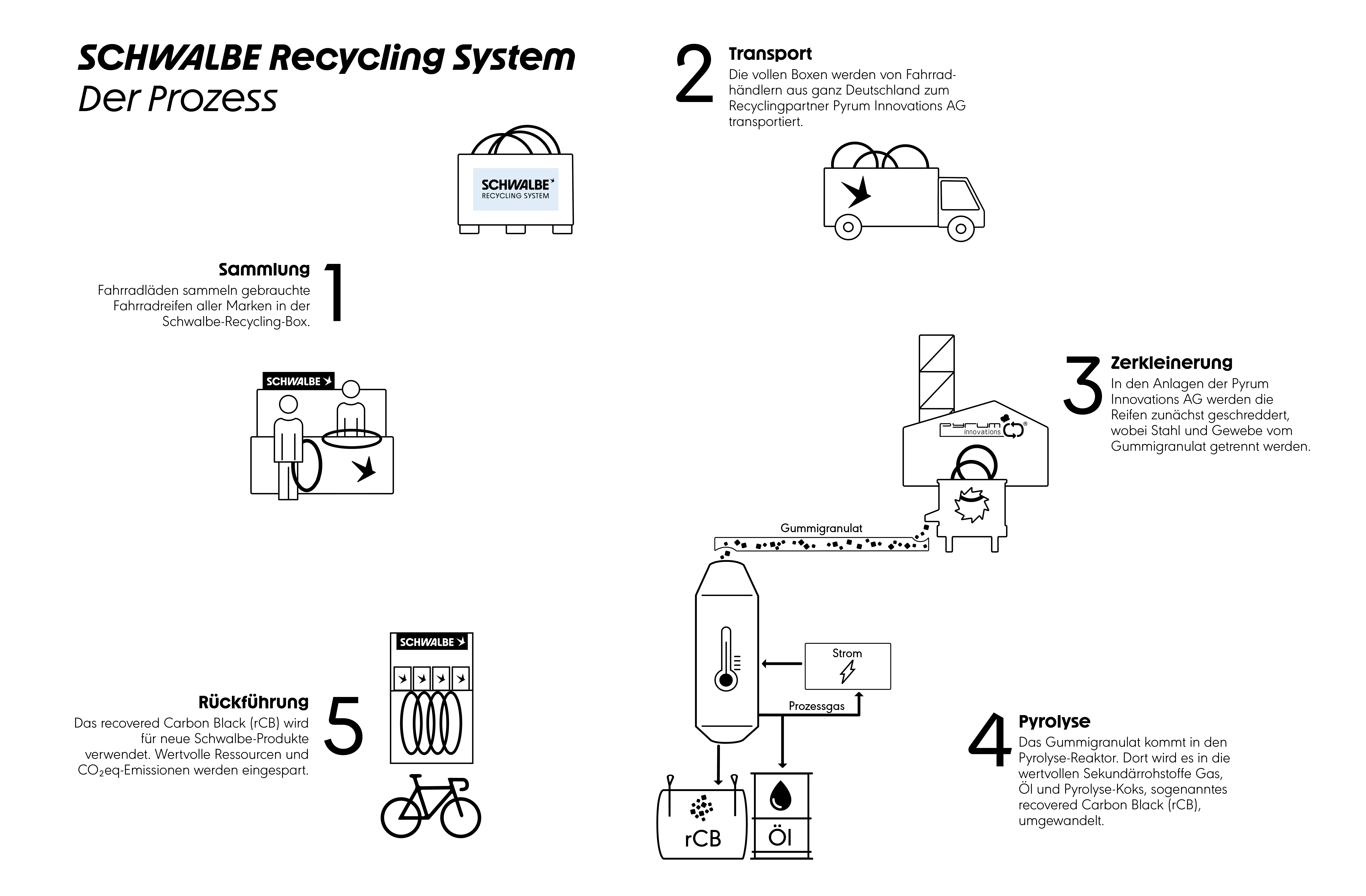 Schwalbe hat in Kooperation mit der TH Köln, sowie dem Partner Pyrum Innovations AG als Forschungsgemeinschaft das SchwalbeRecycling-System entwickelt.
