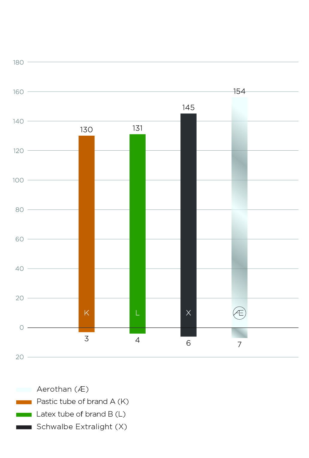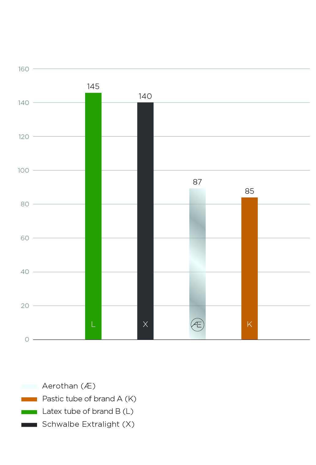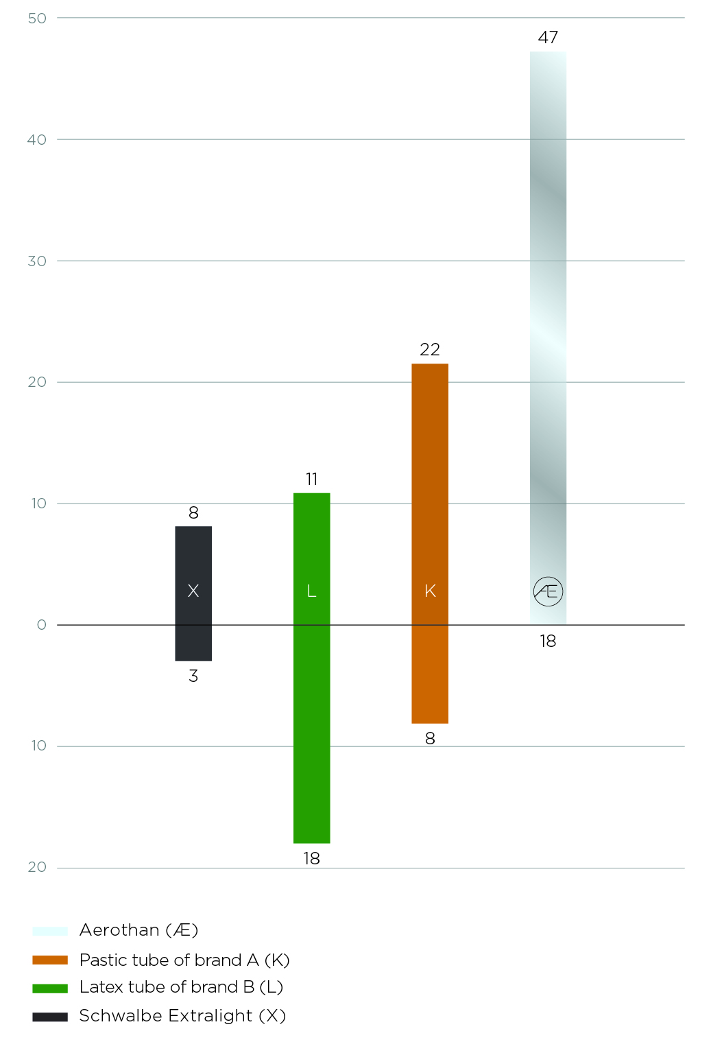 The Aerothan Tube is superior to all other tubes in the test in terms of force application at 47 N and on a par with a latex tube in terms of stretch behavior at 18 mm.