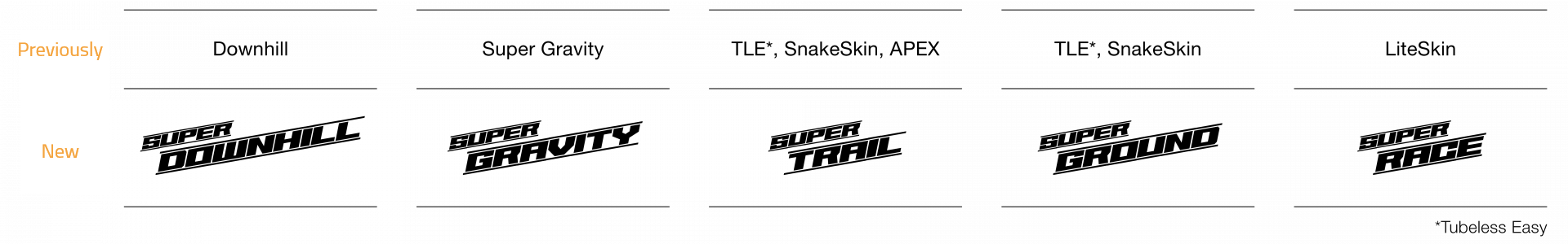 Our goal was to make the names of all construction types as self-explanatory as possible. In this way, even absolute beginners can now find their carcass quickly and easily. Whether downhill, trail or race is their focus. It should never be forgotten that MTB riders prefer to spend their time on the bike rather than reading and comparing tables.