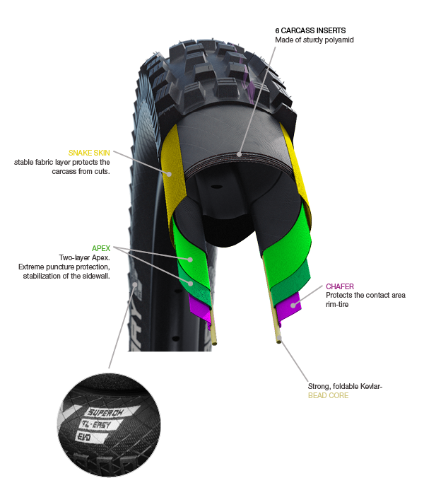 The most robust and stable (super) construction is double-layered. Six carcass layers protect the tread even at very low air pressures. The side walls are reliably protected against cut and pinch damage by a combination of four carcass layers and a stable fabric layer. A special APEX layer protects against cuts and increases the lateral stiffness of the tire. Due to the very stable folding core, the tires are also Tubeless easy.