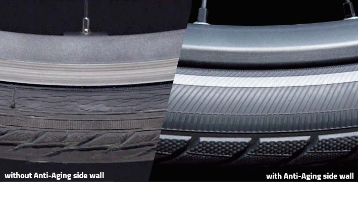Weather influences and insufficient air pressure can cause bicycle tires to age prematurely. That's why we've developed an anti-aging technology: It prevents ugly cracks from forming on the sidewalls of the tires. At the same time, the Marathon Plus and the Marathon Plus Tour live up to their name with their rubber compound: the ADDIX compound covers thousands of kilometers with excellent riding characteristics and low abrasion. And with the Marathon E-Plus, the ADDIX-E compound, which is particularly suitable for the specifically higher loads of e-bikes, ensures maximum durability and grip.