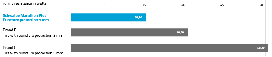 Due to the unique puncture protection, the weight of the Marathon Plus tires is slightly higher - but the rolling properties are excellent. The test in the laboratory confirms what the rider feels on the bike: the Marathon Plus tires roll much more easily than other tires with similarly thick puncture protection belts.