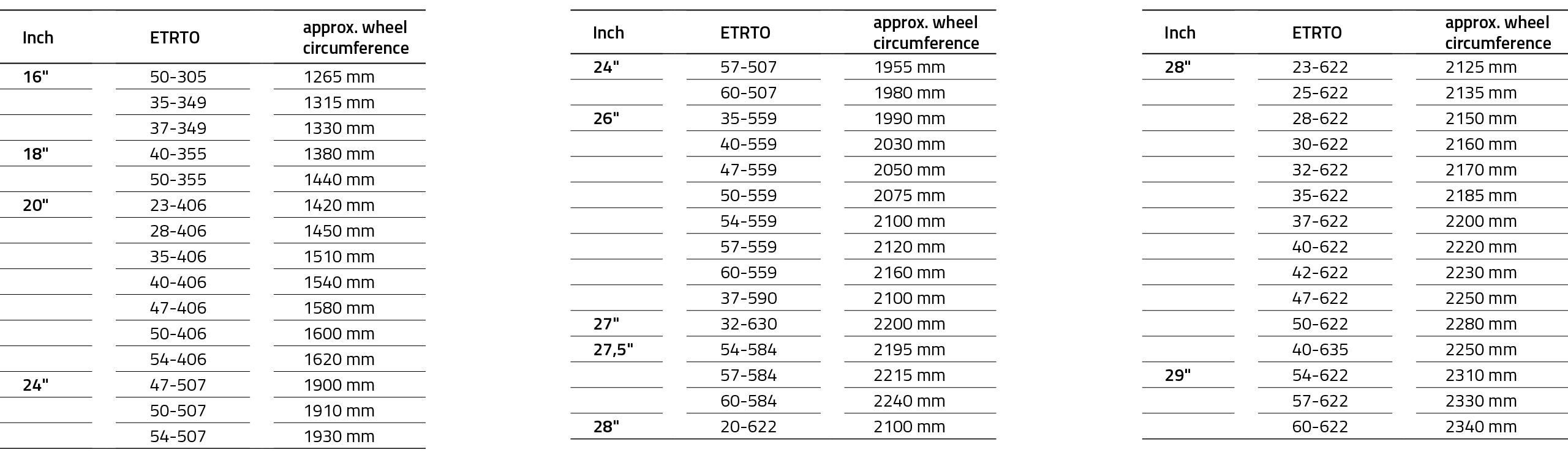 Exact tire circumferences are often required for precise programming of the bike computer. The wheel circumference varies depending on the inner rim width, puncture protection in the tire, air pressure and weight load. For this reason, we cannot specify the exact wheel circumferences. For precise programming of a wheel computer, we recommend a simple rolling test with the rider in the saddle: Align the valve from the front wheel at the bottom 6 o’clock position, make a mark on the floor or lay the end of a tape measure at this point, roll the bike forward in as straight a line as possible until the front has done one full rotation and the valve is once again the 6 o’clock position. Then take the distance measurement directly from the tape measure or mark the floor at this point and measure between the two marks. This distance will give you a fairly precise rolling circumference for the front wheel which can be entered into your computer.