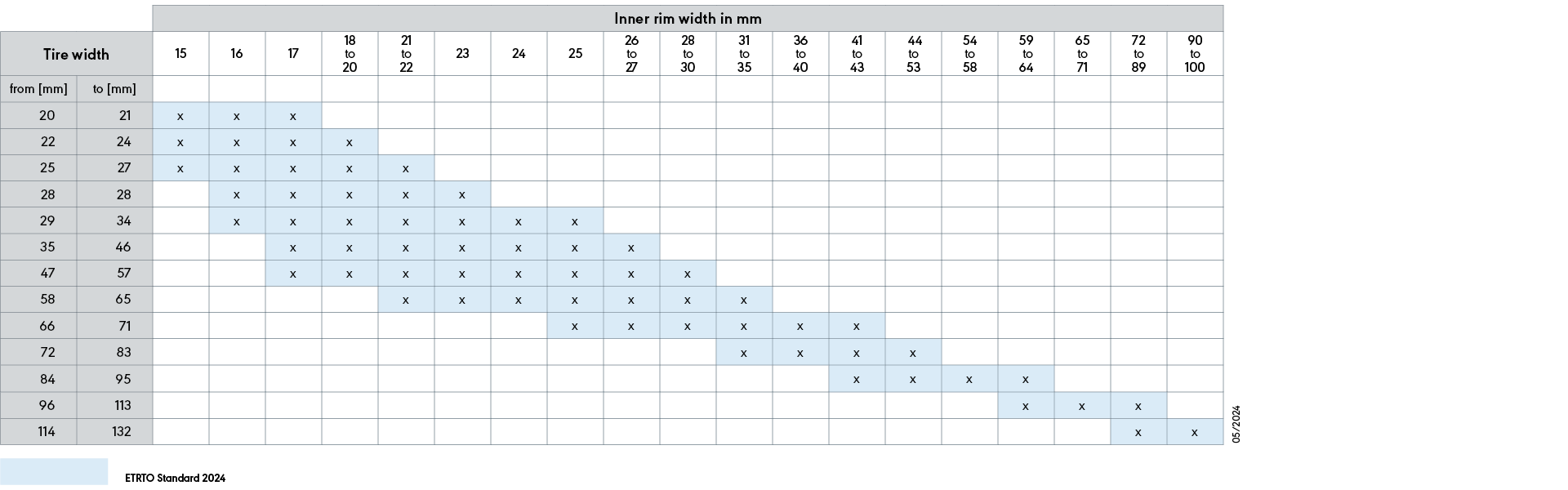 Possible combinations of tire width and inner rim width