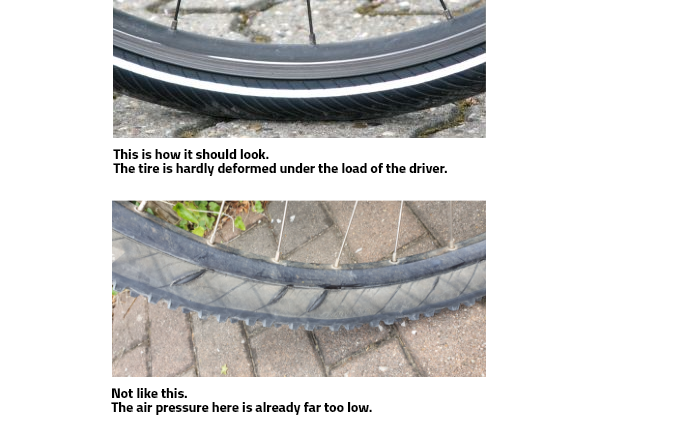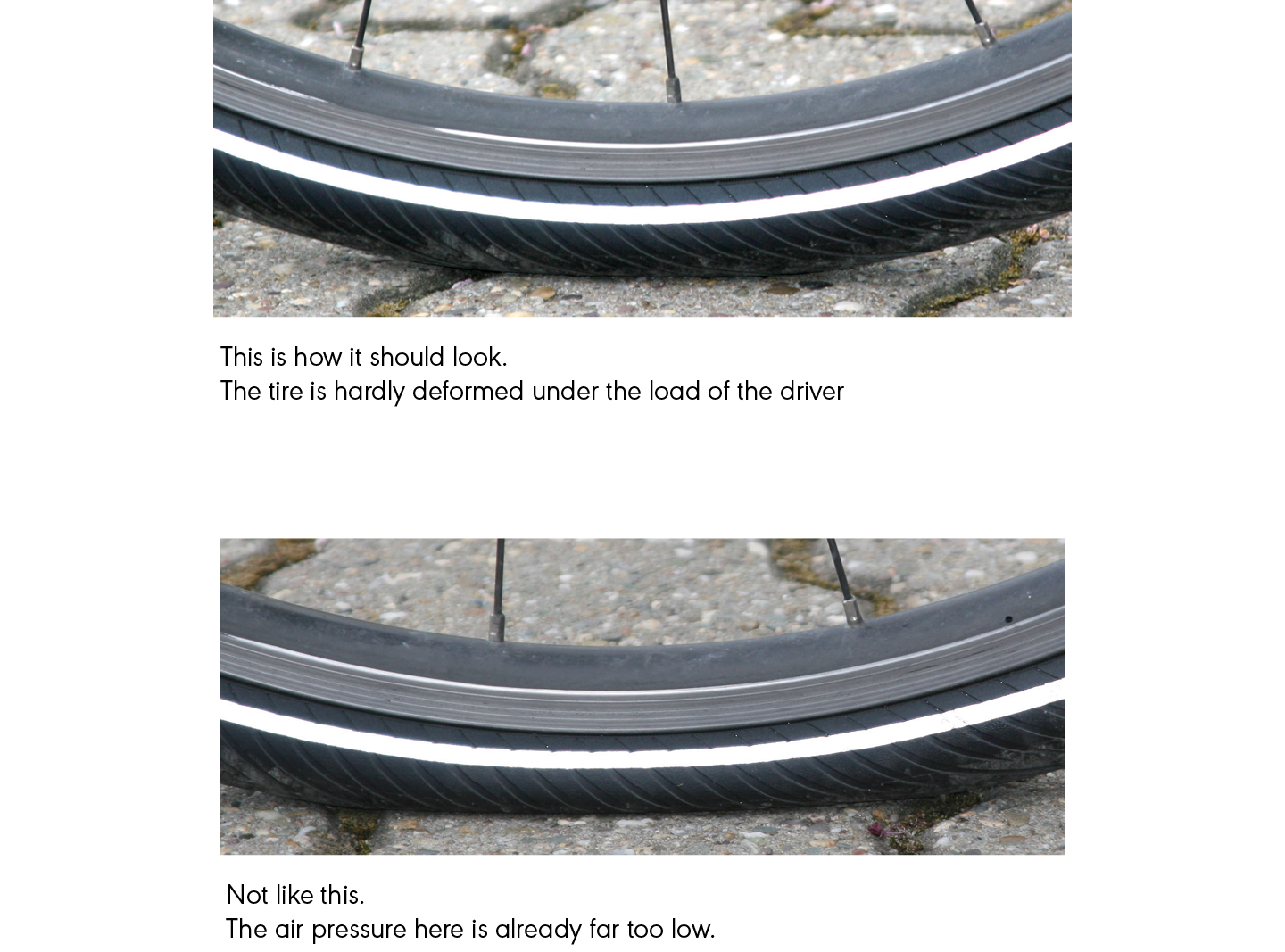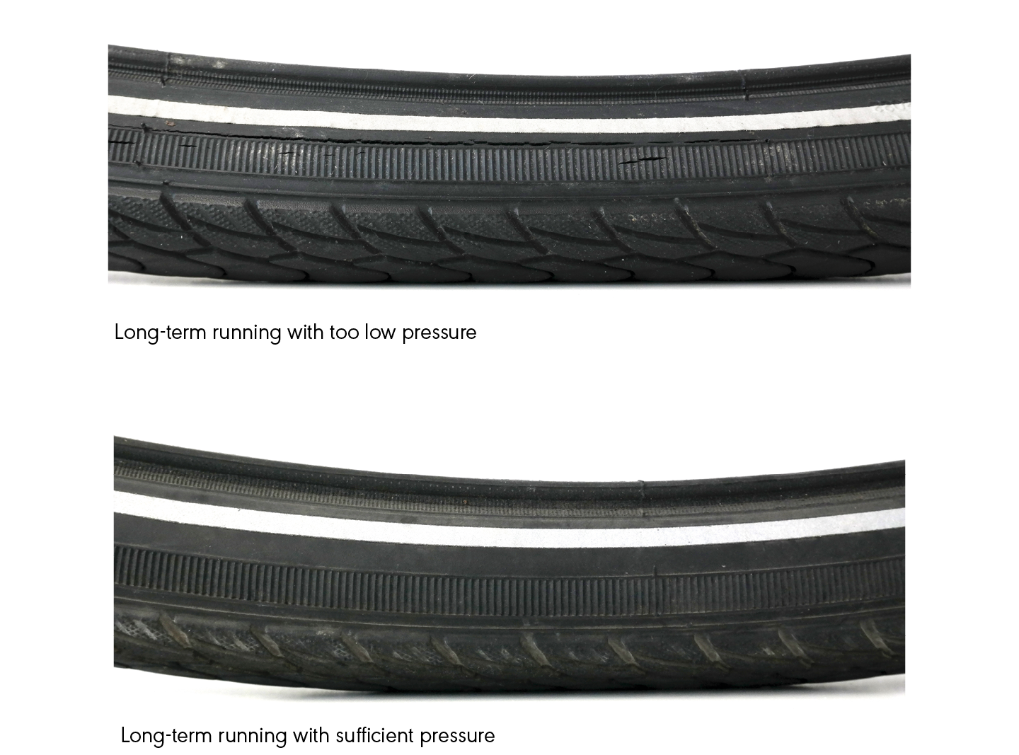 Only with sufficient air pressure is the tire able to carry the bike. On the road, where the surface is very smooth, the higher the air pressure, the lower the rolling resistance of the tire. The susceptibility to punctures is also lower at high pressure. A permanently low air pressure often leads to premature tire wear. Cracking of the sidewall is the typical result. Abrasion is then also unnecessarily high.