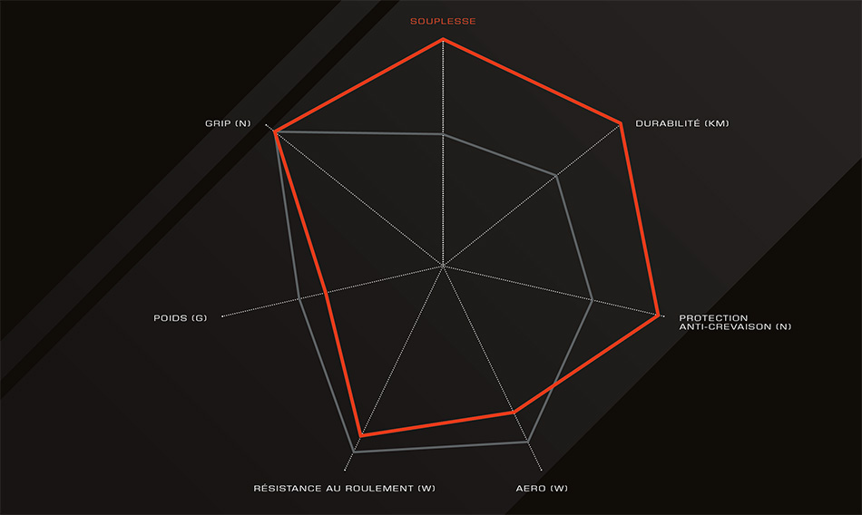 Grâce à une collaboration intensive avec des athlètes de haut niveau et de la relève, nous avons constaté que les coureurs souhaitent un pneu qui ne roule pas seulement rapidement et facilement, mais qui offre également un maximum de souplesse. Un pneu qui exécute rapidement et précisément les ordres du conducteur et qui donne à tout moment un feedback sensible. Un pneu qui "vit". Logique, car outre la sensation de conduite unique, le surplus de souplesse présente un autre avantage de taille : le cycliste se fatigue moins vite. Par conséquent, il peut fournir des performances plus élevées ou plus longues. Cela peut non seulement être prouvé scientifiquement par des tests et des calculs, mais aussi être expérimenté sur le vélo.