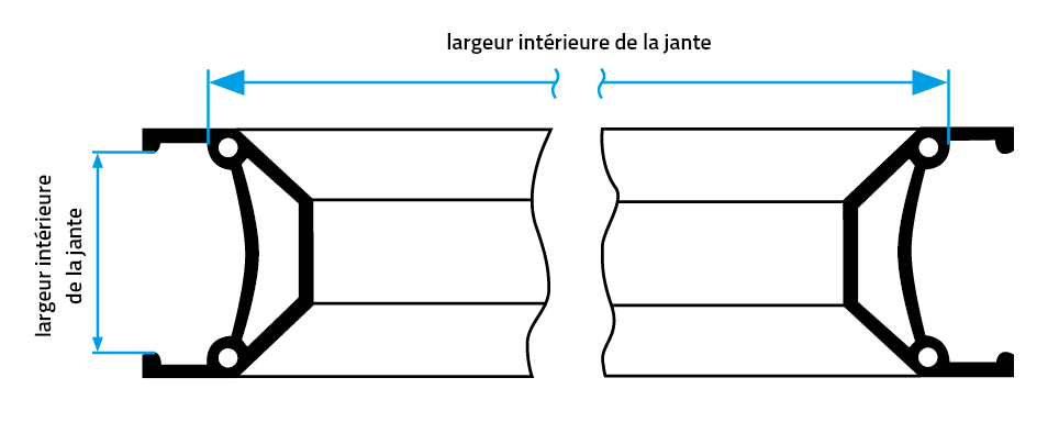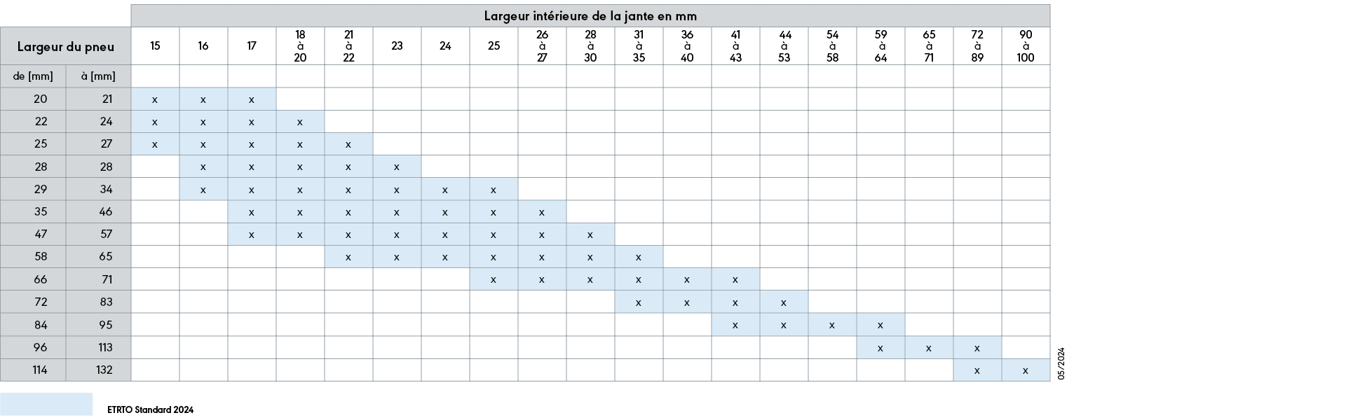 Le diamètre intérieur du pneu doit correspondre au diamètre de l'épaulement de la jante. Par exemple, un pneu de taille 37-622 peut être monté sur une jante de 622 x 19C. En outre, la largeur du pneu et l'ouverture intérieure de la jante doivent être compatibles. Le tableau indique les combinaisons possibles de largeur de pneu et de largeur intérieure de jante selon l'ETRTO, complétées par les recommandations de Schwalbe.
