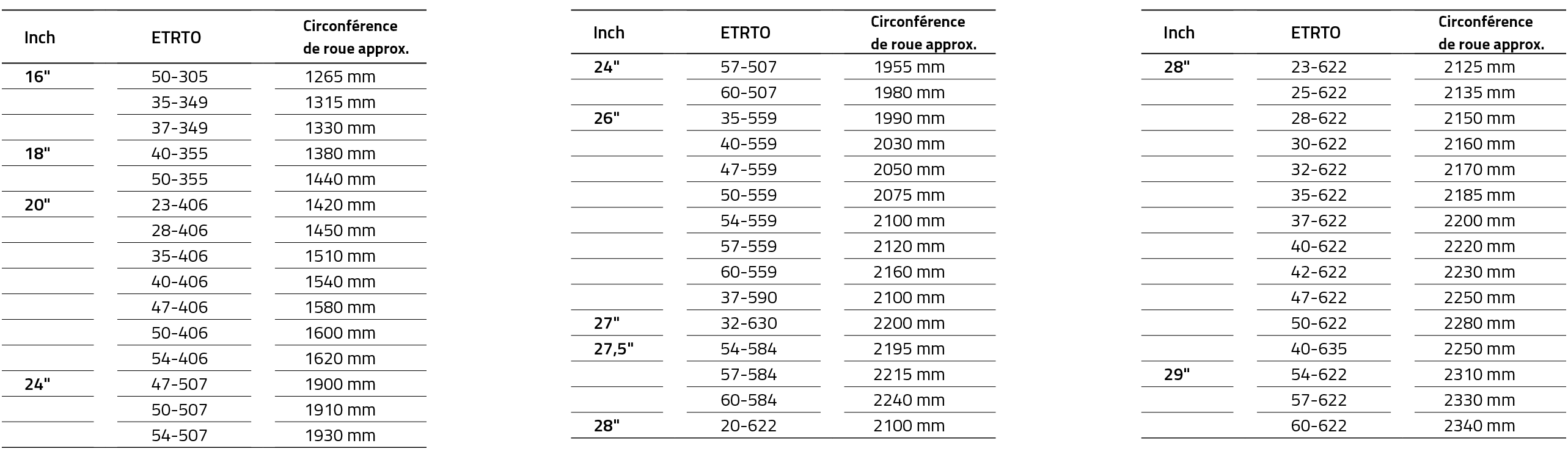 Pour programmer précisément le compteur de vélo, on demande souvent les circonférences exactes des pneus. La circonférence des roues varie en fonction de la largeur intérieure de la jante, de la protection anti-crevaison du pneu, de la pression de gonflage et du poids. C'est pourquoi nous ne pouvons pas indiquer les circonférences exactes des roues. Pour programmer avec précision un compteur de roue, nous recommandons un simple essai de roulement avec le cycliste en selle : orienter la valve de la roue avant verticalement vers le bas, la faire glisser le long d'une règle et déterminer la valeur jusqu'à ce que la valve soit à nouveau verticale vers le bas. Vous avez ainsi déterminé la valeur circonférentielle exacte pour votre combinaison pneu/jante.