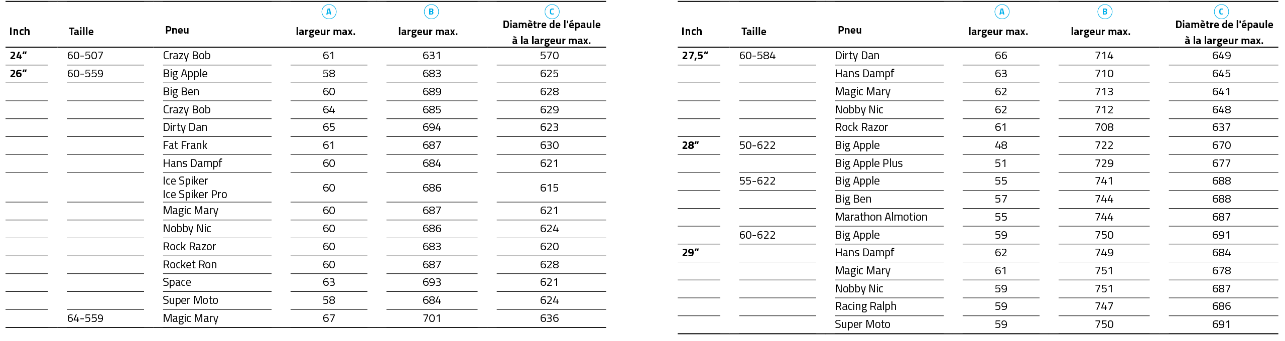 Les types compatibles (tubeless) et les largeurs de pneus indiqués par le fabricant de roues/jantes doivent être pris en compte. En particulier les largeurs minimales des pneus.