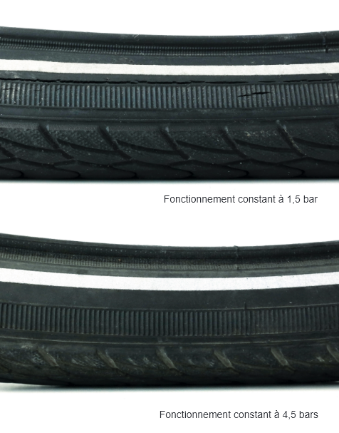 Ce n'est qu'en étant suffisamment gonflé que le pneu est en mesure de supporter le vélo. Sur la route, plus la pression de gonflage est élevée, plus la résistance au roulement du pneu est faible. Le risque de crevaison est également plus faible lorsque la pression est élevée. Une pression de gonflage durablement trop faible entraîne souvent une usure prématurée du pneu. La formation de fissures sur le flanc en est la conséquence typique. L'usure est alors également inutilement élevée.