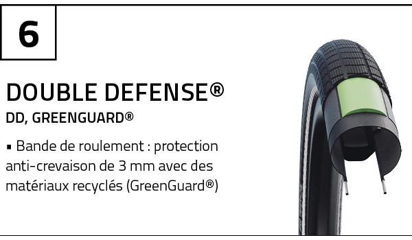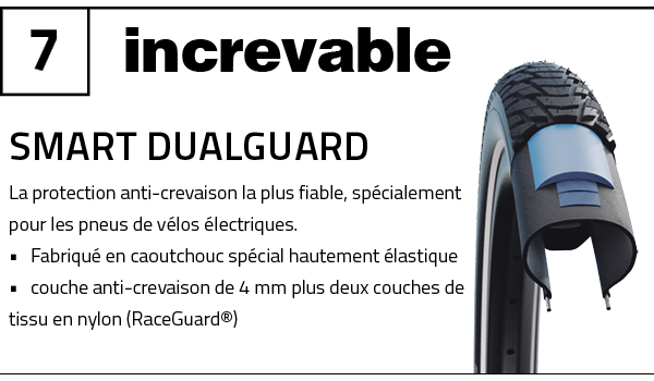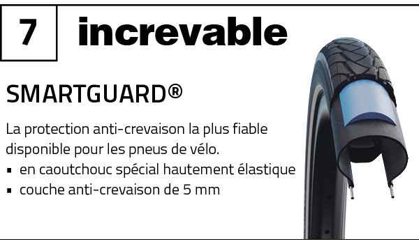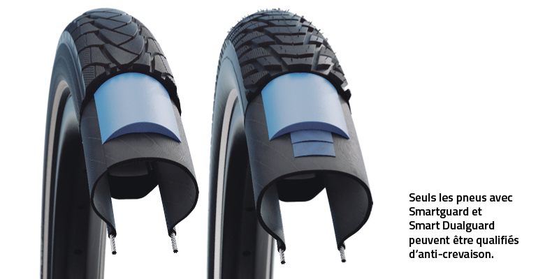 Les pneus de vélo les plus sûrs pour la plupart des utilisations sont nos pneus "increvables". Par exemple, les inserts SmartGuard en caoutchouc spécial hautement élastique ont une épaisseur d'environ 5 mm et sont extrêmement résistants. Cette technique présente un avantage décisif pour les objets enfoncés, qui sont sans cesse écrasés et qui percent ainsi continuellement toute ceinture de protection. C'est là que la SmartGuard fait valoir l'avantage de son épaisseur. Une punaise enfoncée, par exemple, reste simplement coincée dans le caoutchouc sans causer de dommages