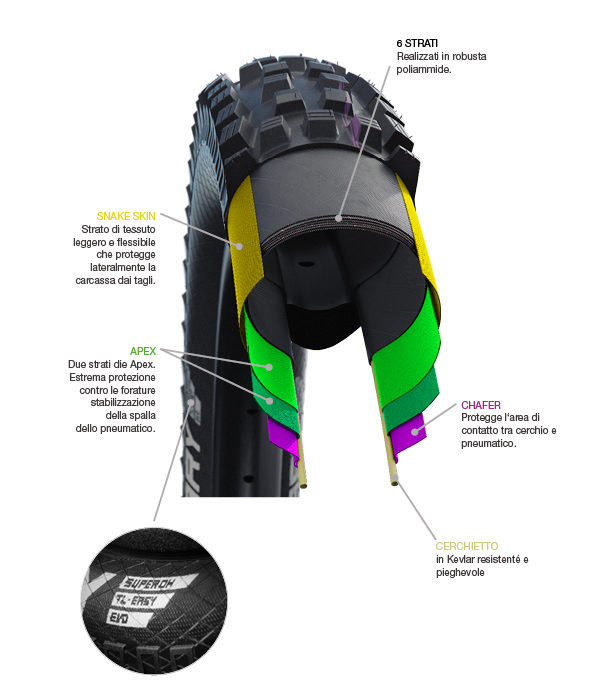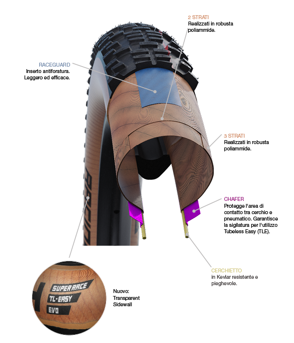 In nessun'altra disciplina l'attenzione alla resistenza al rotolamento e al peso è così estrema come nelle competizioni di cross-country e marathon. Con la nuova costruzione Super Race, stabiliamo nuovi standard anche per quanto riguarda la morbidezza: nessun'altra carcassa rotola così facilmente sul terreno e garantisce così tanta trazione come la Super Race.