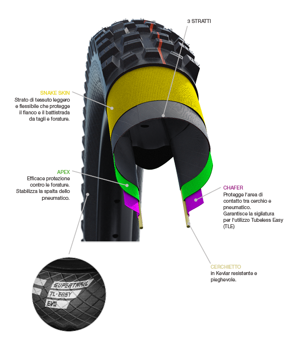 100% personalizzati per i rispettivi campi di applicazione. Più performance. Selezione semplice. In esclusiva per gli pneumatici Schwalbe MTB della linea Evolution. Tubeless Easy e con mescole Addix. Concetto generale innovativo, sviluppato per il nuovo decennio.