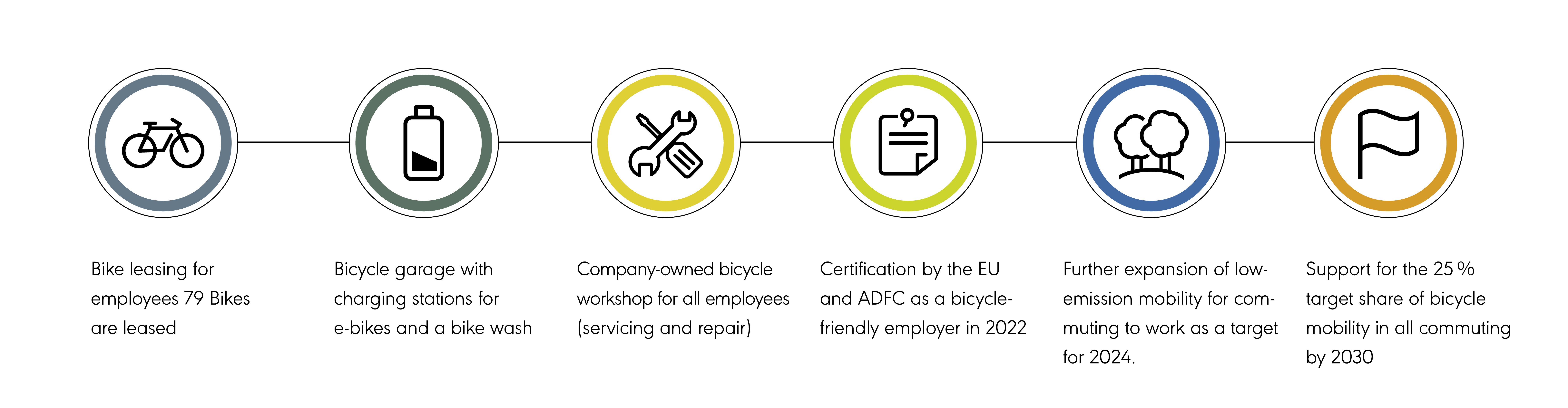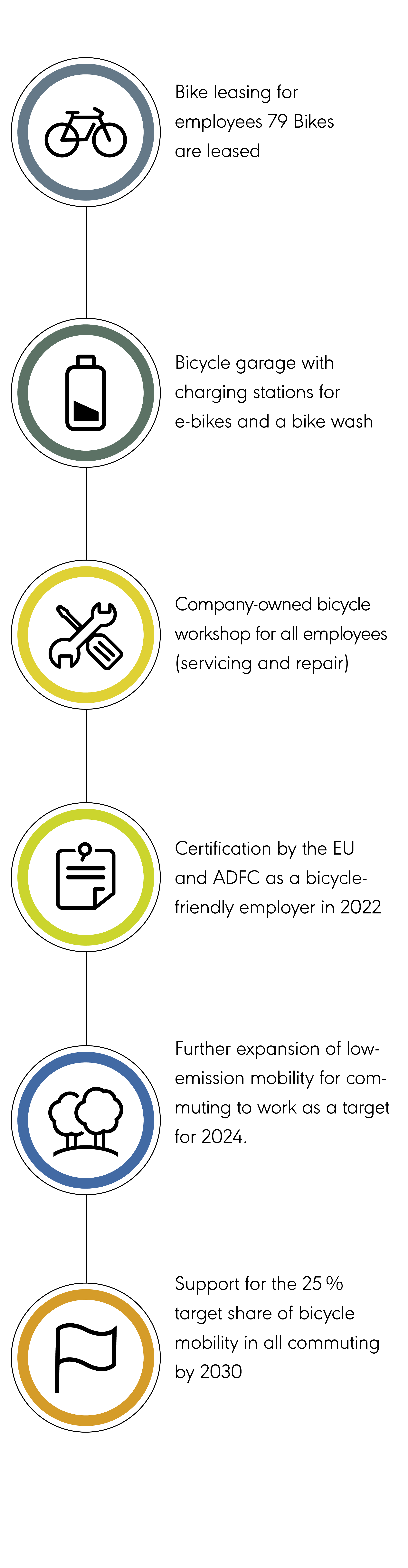 Creiamo incentivi specifici per ridurre il traffico pendolare, introducendo sistemi interni di premi per incentivare l'uso della bicicletta. Inoltre, sosteniamo le strutture per la mobilità con la bicicletta presso il Bikepark Winterberg e ci adoperiamo per un'ulteriore espansione dei sentieri e delle piste ciclabili nel quartiere di Oberbergisch. Vogliamo fungere da modello e mostrare come sia possibile promuovere una cultura della bicicletta all'interno di un'organizzazione. In questo modo, ci consideriamo promotori e co-creatori della rivoluzione della mobilità. Anche se abbiamo già attuato numerose misure in questo senso (vedi Persone - motivazione e prospettive), siamo costantemente impegnati a migliorare.