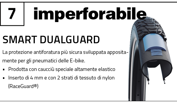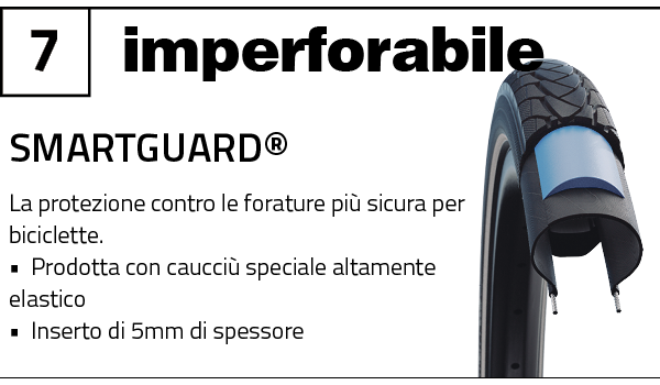 Lo pneumatico più sicuro per la maggior parte degli impieghi è il nostro pneumatico "non perforabile" Marathon Plus. La protezione SmartGuard, realizzata in gomma speciale altamente elastica, ha uno spessore di circa 5 mm. Il vantaggio decisivo della SmartGuard® sta nella sua efficacia contro i corpi estranei che si conficcano nel battistrada e ad ogni rotazione finiscono con il penetrare qualunque inserto di protezione. Ecco il vantaggio dello spessore della protezione SmartGuard. Per esempio, una puntina da disegno riesce a penetrare solo nell’inserto, senza causare ulteriori danni.