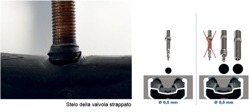 Attenzione: se si utilizzano camere d’aria con valvola Sclaverand su cerchi che hanno fori più grossi, le valvole si possono facilmente strappare perché i bordi taglienti del foro possono distaccare il corpo della valvola dalla camera.