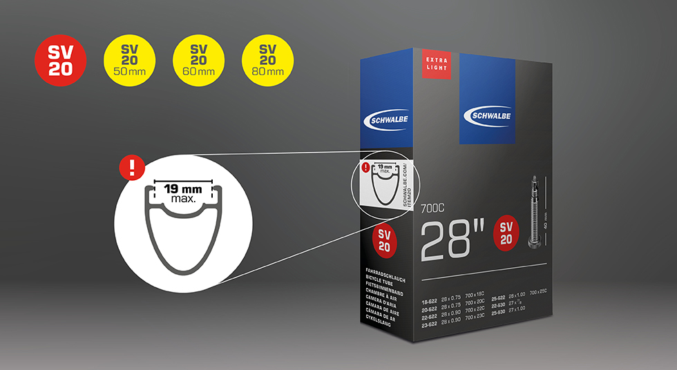 Aus diesem Grund dürfen Schwalbe-Schläuche der Gruppe Item 20 „Extralight“ ausschließlich mit Felgen mit einer maximalen Innenmaulweite von 19mm (19C) verwendet werden. Voraussetzung ist die Kombination mit den laut Kennzeichnung freigegebenen Reifen-Dimensionen (18/25-622/630).