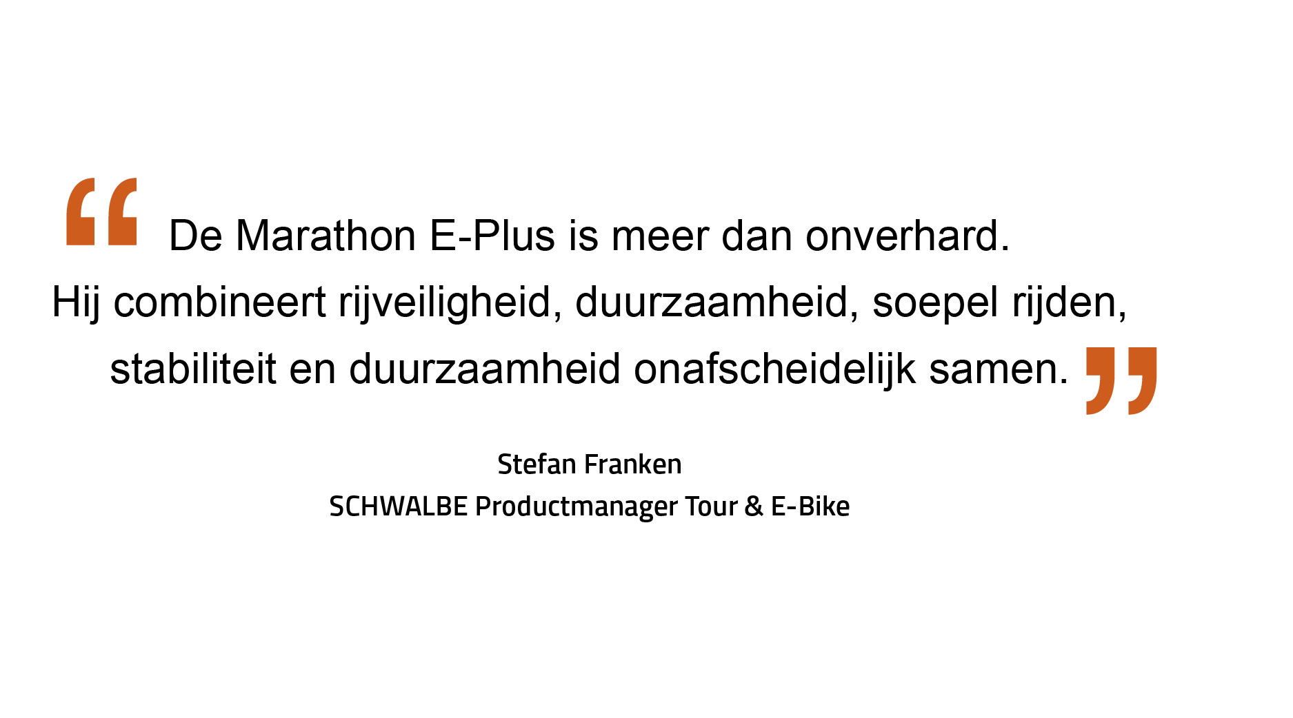 Als antwoord op deze uitdaging heeft Schwalbe de Marathon E-Plus met Smart DualGuard ontwikkeld: een band waarvan de onplatbaar® anti-lek technologie consequent op de specifieke eisen van e-bikes is afgestemd. Tegelijkertijd verenigt de Marathon E-Plus rijveiligheid, duurzaamheid, een rustige loop, stabiliteit en een lange levensduur onlosmakelijk met elkaar.