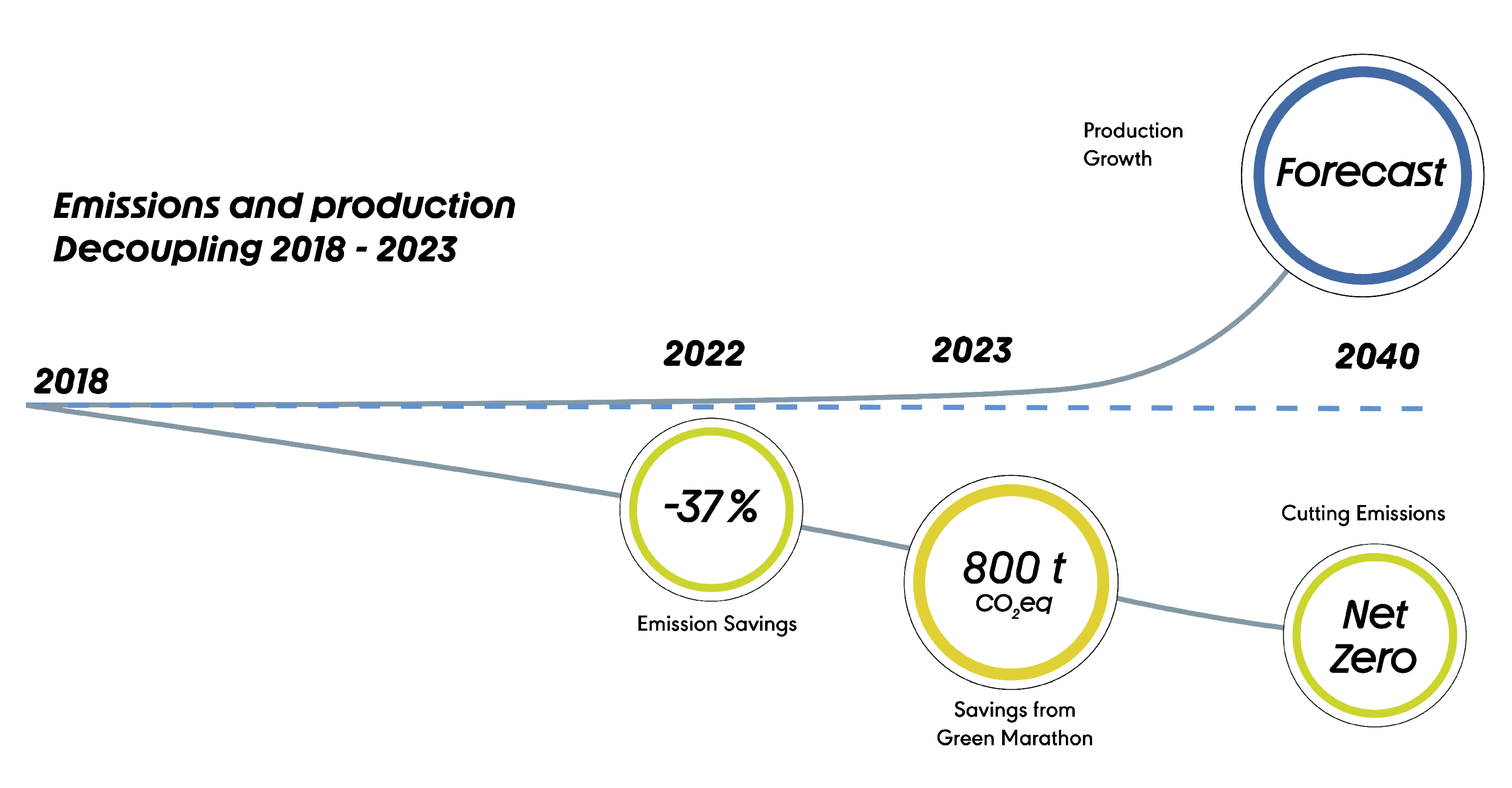 Ondanks onze sterke productiegroei tussen 2020 en 2022 zijn we erin geslaagd om onze productie-uitstoot aanzienlijk te verminderen met 46 procent ten opzichte van 2018 en 2022. Dit proces, dat bekend staat als "ontkoppeling", betekent dat we erin geslaagd zijn om de productiegroei los te koppelen van het genereren van extra uitstoot.