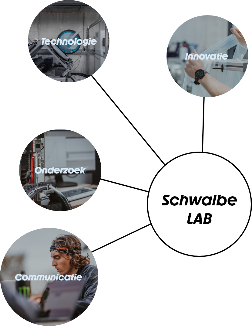 In het Schwalbe LAB laten wij ons inspireren. Van binnen en van buiten. Alleen zo ontstaan de nieuwe innovaties van de toekomst. Nieuwe maatstaven op alle gebieden. Dat is waar het Schwalbe LAB voor staat. Nieuwe technologieën, die samen met atleten getest en ontwikkeld worden, worden ook in alledaagse banden toegepast en zijn zo voor iedere fietser beschikbaar