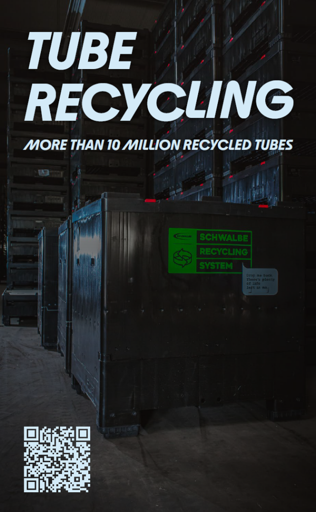 Schwalbe lanceert zijn recyclingprogramma voor binnenbanden in nog twee landen: Per direct kunnen klanten ook in Frankrijk en Italië gebruikte binnenbanden bij de vakhandel inleveren. Deze worden gebundeld bij Schwalbe ingeleverd en via een zelf ontwikkeld devulkanisatieproces gerecycled en gebruikt voor de productie van nieuwe producten. Elke standaard binnenband van Schwalbe bestaat nu al voor 20 procent uit gerecyclede grondstoffen. De energiebalans van het recyclingproces, inclusief alle transportroutes, is zeer positief. In vergelijking met de productie van dezelfde hoeveelheid nieuw butyl wordt 80 procent energie bespaard.