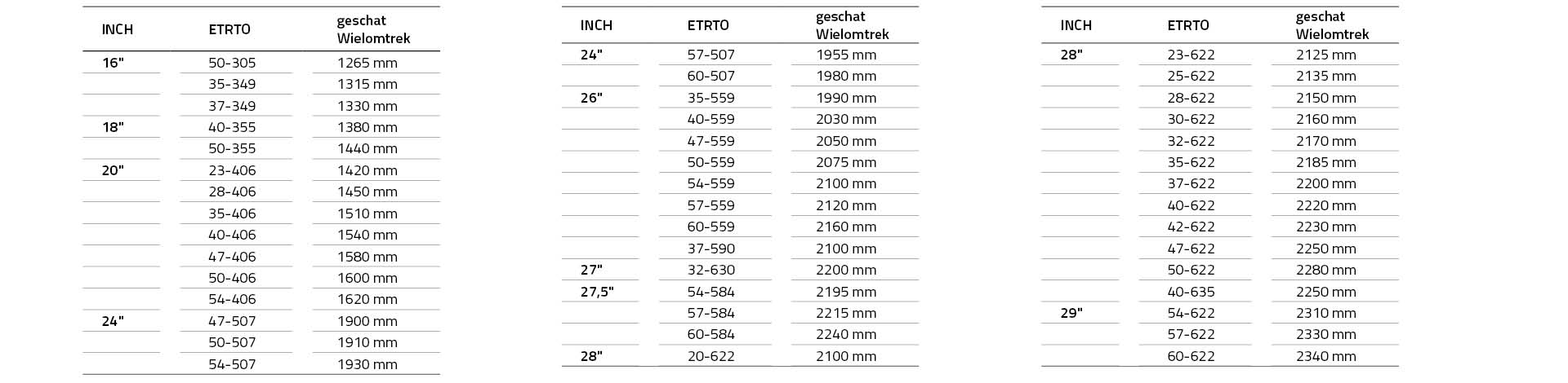 Exacte wielomtrekken zijn vaak nodig voor een nauwkeurige programmering van de fietscomputer. De wielomtrek varieert afhankelijk van de breedte van de binnenvelg, de lekbescherming in de band, de luchtdruk en de gewichtsbelasting. Daarom kunnen we geen exacte wielomtrek opgeven. Voor een nauwkeurige programmering van een wielcomputer raden we een eenvoudige roltest aan met de fietser in het zadel: Richt het ventiel van het voorwiel verticaal omlaag, schuif het over een schaalverdeling en bepaal de waarde totdat het ventiel weer verticaal omlaag staat. Dit geeft je de exacte omtrekwaarde voor je band/velgcombinatie.