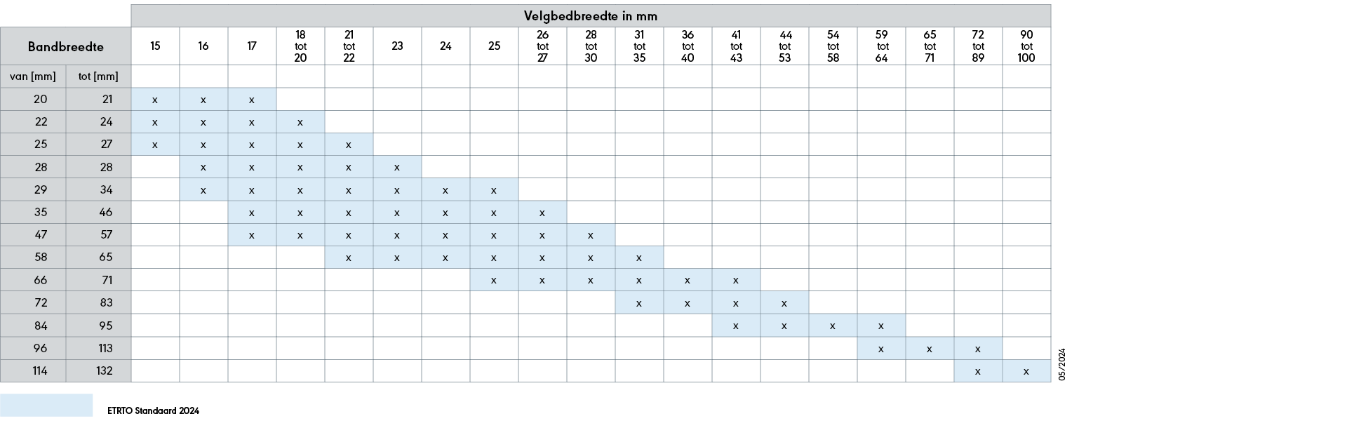 Mogelijke combinaties van bandbreedte en binnenvelgbreedte