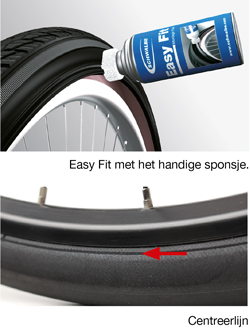 Idealiter gebruikt u de Schwalbe bandenlichters en ook de Schwalbe EASYFIT montagevloeistof of een oplossing van een beetje water met een druppel zeep of afwasmiddel. Aangebracht aan beide zijden van de bandhiel glijdt de bandhiel beter in de velgrand.
