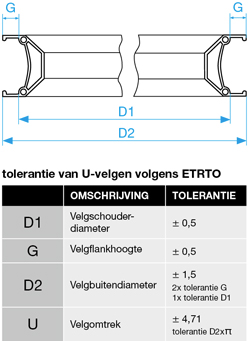 Velgen mogen een tolerantie van ± 0,5 mm in diameter hebben (D1). Daarnaast kan de hoogte van de zijwand van de velg ook een tolerantie van ± 0,5 mm hebben (G). Dit resulteert in een totale tolerantie van ± 1,5 mm in de buitendiameter (D2) en ± 4,7 mm in de buitenomtrek (U). Dit komt overeen met een maximaal mogelijk omtrekverschil van 9,4 mm tussen de grootste en kleinste velg.