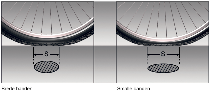 Bij dezelfde luchtdruk hebben de brede en de smalle band hetzelfde contactoppervlak. Terwijl de brede band de neiging heeft in de breedte af te vlakken, heeft de dunne band een smaller maar langer contactvlak.