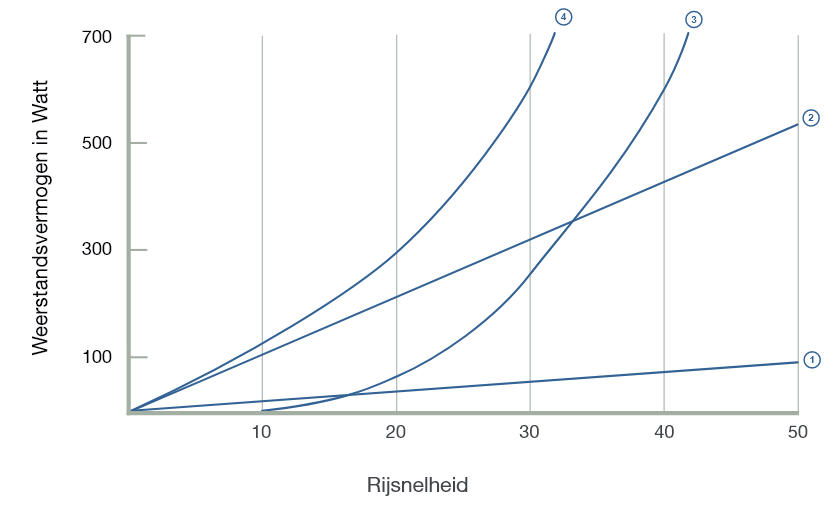 De luchtweerstand neemt in het kwadraat toe met toenemende snelheid. Op het vlakke maakt luchtweerstand al bij ongeveer 20 km/u het grootste deel uit van de totale weerstand.