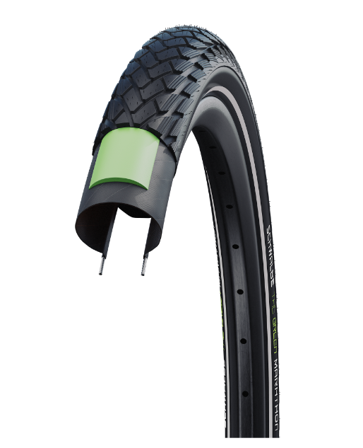 Insgesamt besteht der Green Marathon zu 80% aus recycelten und erneuerbaren Rohstoffen, darunter zu 100% fair gehandeltem Naturkautschuk (Fair Rubber). Schwalbe hat dazu eine detaillierte Ökobilanz zur Quantifizierung der Umweltwirkungen des Green Marathons vorgestellt. Das Ergebnis: Mit 1,43kg CO₂eq spart der Green Marathon insgesamt 41% CO₂eq im Vergleich zu seinem Vorgängermodell ein. Trotz des bedeutend niedrigeren CO₂eq-Fußabdrucks geht der Reifen keinerlei Kompromisse bei Qualität, Pannenschutz oder Laufleistung ein.