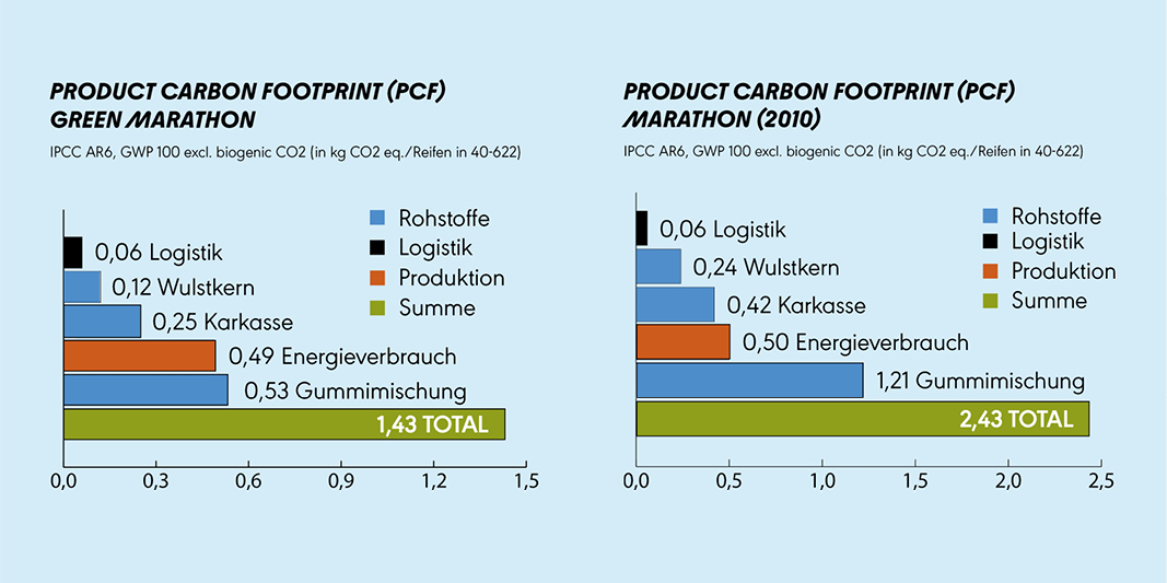 Zur Ermittlung der CO2eq-Ersparnis auf Basis der Normen DIN EN ISO 14040, 14044 und 14067 wurde jeweils ein ausführlicher PCF beider Marathon-Modelle berechnet und mit der Software „LCA for Experts“ nach dem gängigen IPCC AR6-Standard (GWP 100, exkl. biogenem CO2) ausgewertet. Konkret handelt es sich bei der Studie um einen „partiellen PCF“, der die Summe der emittierten Treibhausgas-Mengen eines Reifens von der Rohstoffgewinnung bis hin zum fertigen Produkt („cradle-to-gate“) beschreibt und als CO2eq angibt. Inkludiert sind alle Rohstoffe, die mindestens 5 Massenprozent am Gesamtgewicht des Reifens ausmachen. Bis 2025 soll die Systemgrenze der Ökobilanzierung erweitert werden, sodass dann der komplette Produktlebensweg von der Rohstoffextraktion bis zum Recycling („cradle-to-cradle“) abgebildet wird und alle Rohstoffe ab 1 Massenprozent einbezogen werden.