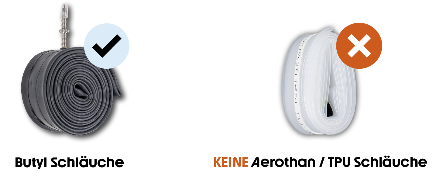 Achtung! Bitte keine Schläuche zurücksenden, die mit Dichtmilch gefüllt sind! Die Dichtmilch tritt aus und durchweicht die Kartons beim Transport.