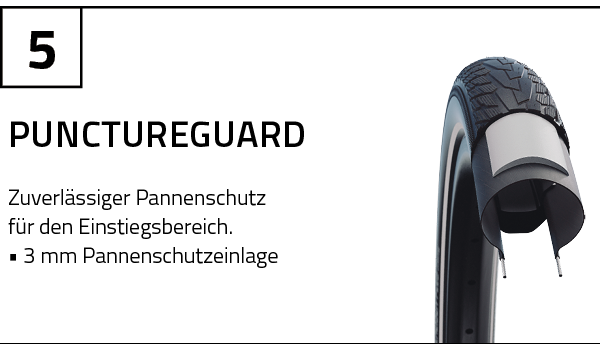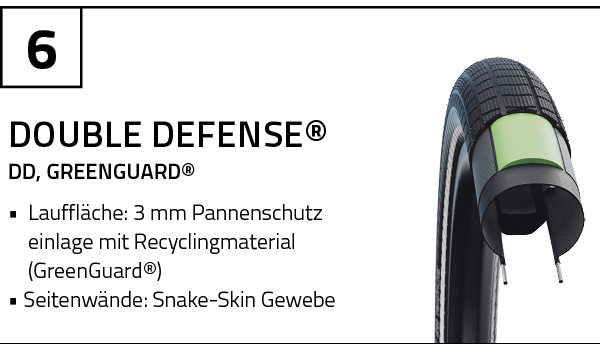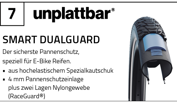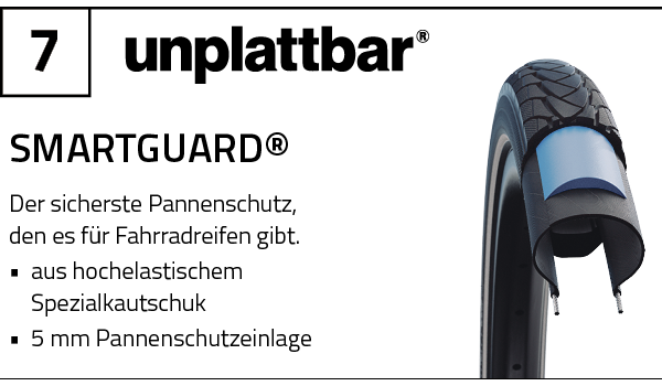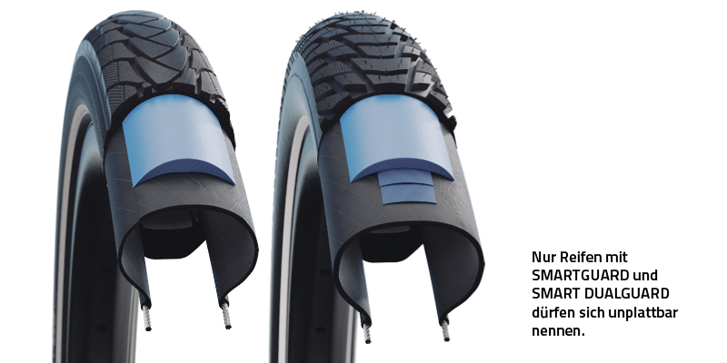 Die sichersten Fahrradreifen für die meisten Einsatzzwecke sind unsere „unplattbar“- Reifen. Zum Beispiel ist die SmartGuard-Einlagen aus hochelastischem Spezialkautschuk ca. 5 mm dick und extrem widerstandfähig. Den entscheidenden Vorteil bringt diese Technik bei eingefahrenen Gegenständen, die immer wieder überrollt werden und sich so stetig durch jeden Schutzgürtel bohren. Hier spielt der SmartGuard den Vorteil der Dicke aus. Eine eingefahrene Heftzwecke z. B. bleibt einfach im Gummi stecken ohne Schaden anzurichten.