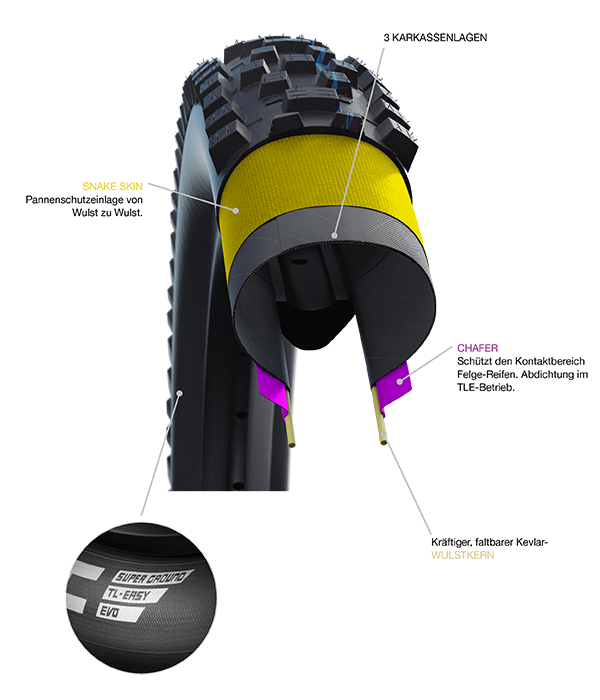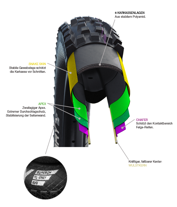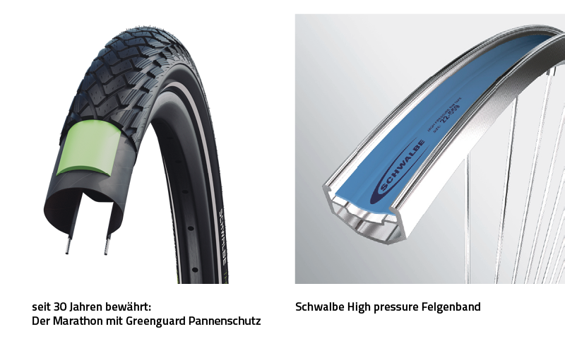 TECHNOLOGISCH SETZT SCHWALBE SEIT VIELEN JAHREN DIE BENCHMARKS FÜR PANNENSCHUTZ AN FAHRRÄDERN. Zwei Beispiele dafür: Nur Schwalbe hat die Reise- und Stadtreifen, die sich „unplattbar“ nennen dürfen (Protection Level 7). Für Mountainbikes wurde Tubeless durch die Schwalbe-Gewebeeinlagen der Tubeless Easy Technologie zum Standard bei leistungsorientiertem Einsatz – und zusammen mit Dichtmilch zum optimalen Pannenschutz (Protection Level 6). Jedes Segment, ob Tour, MTB oder Rennrad und Gravel, hat unterschiedliche Anforderungen an Sicherheit und Leistung. Daher unterscheiden sich die Konstruktionen und Pannenschutzsysteme von Reifen dieser Kategorien teilweise deutlich voneinander. Hier zeigen wir auf welche Pannenschutzgürtel und Konstruktionen es für die jeweiligen Kategorien gibt.