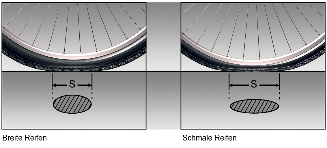 Bei gleichem Luftdruck haben der breite und der schmale Reifen eine gleich große Aufstandsfläche. Während sich der breite Reifen eher in die Breite platt drückt, hat der dünne Reifen eine schmalere aber längere Aufstandsfläche.