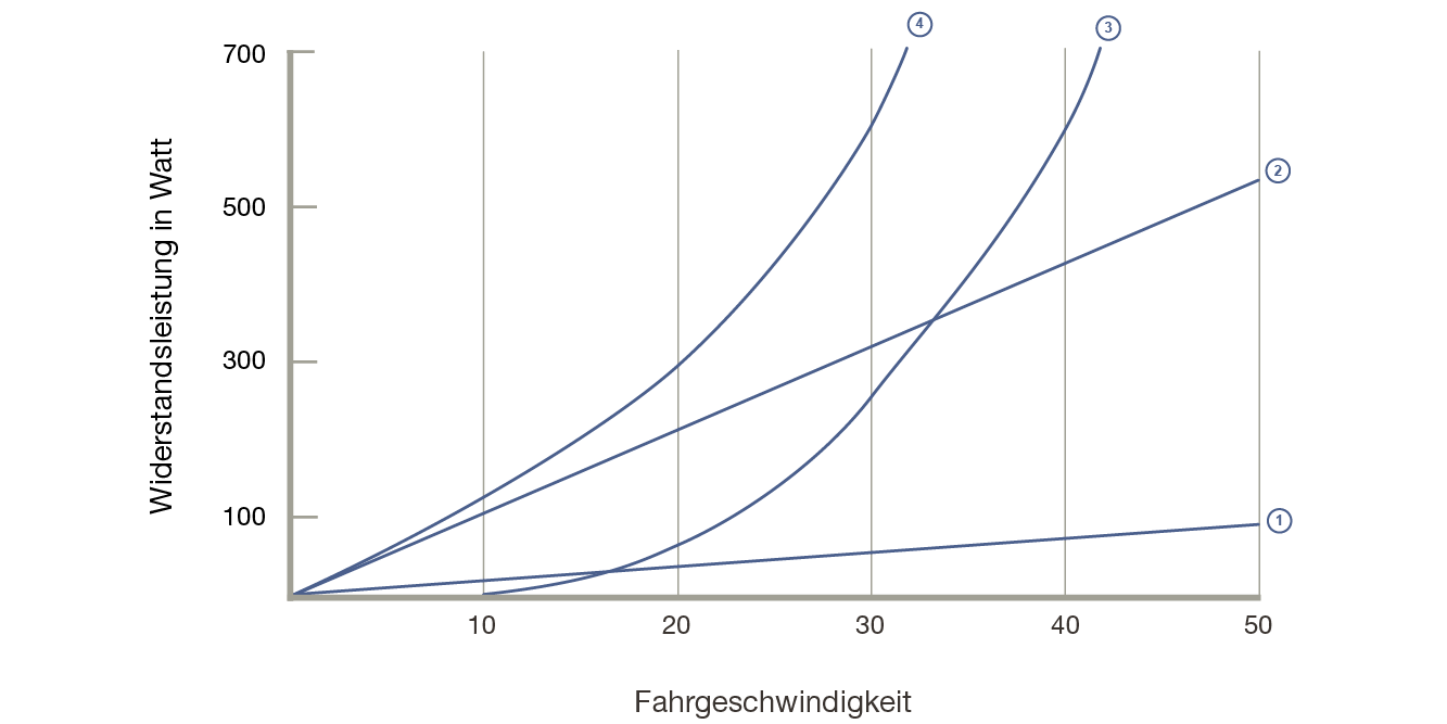 Der Luftwiderstand steigt mit zunehmender Geschwindigkeit im Quadrat. In der Ebene hat der Luftwiderstand bereits bei ca. 20 km/h den größten Anteil am Gesamtwiderstand.
