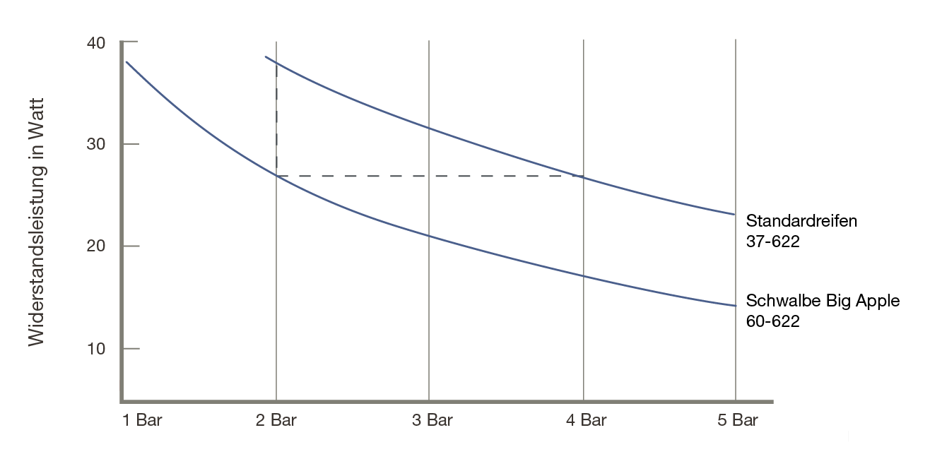 Bei eher gleichmäßigen Geschwindigkeiten um die 20 km/h fährt man aber mit breiteren Reifen besser. In der Praxis ist die Kraftersparnis dabei noch größer als in der Theorie: Der Federungseffekt der breiten Reifen hält Erschütterungen vom Fahrer fern und spart so Energie.