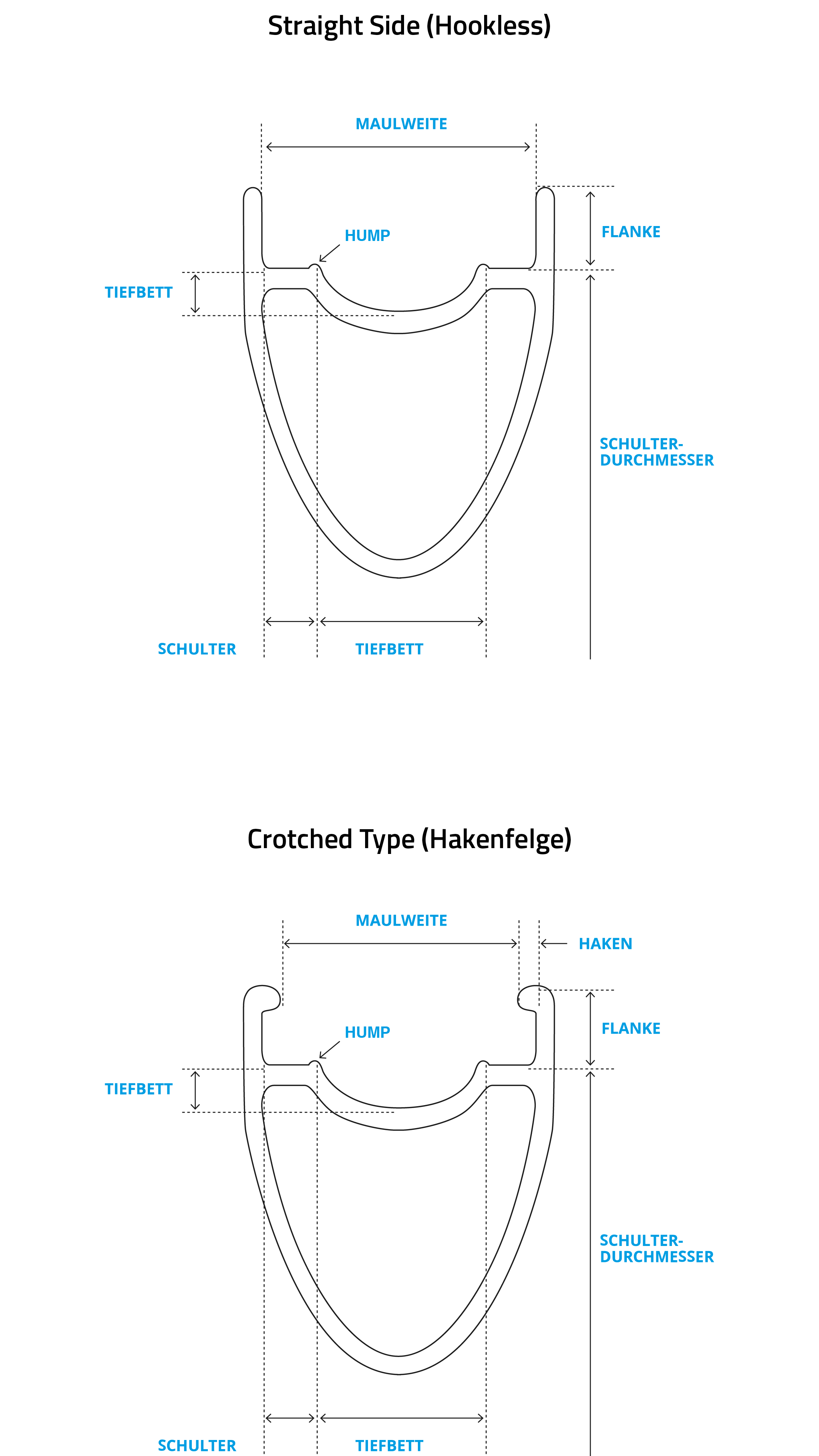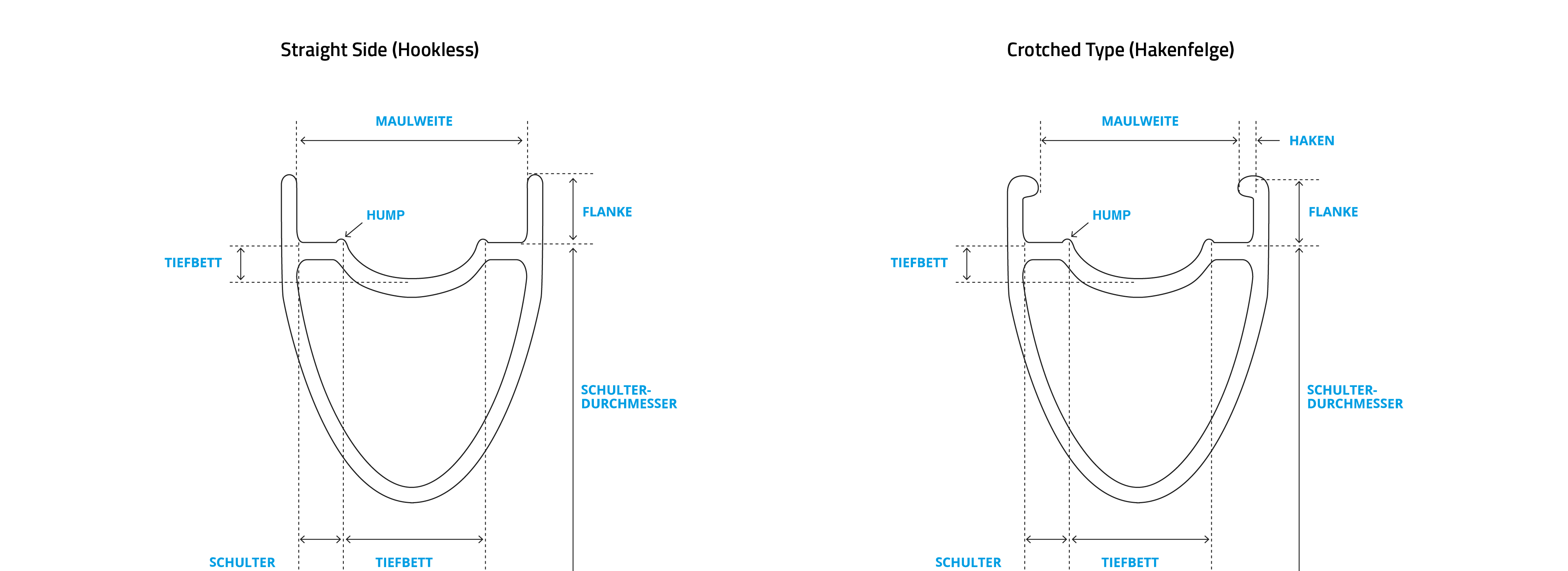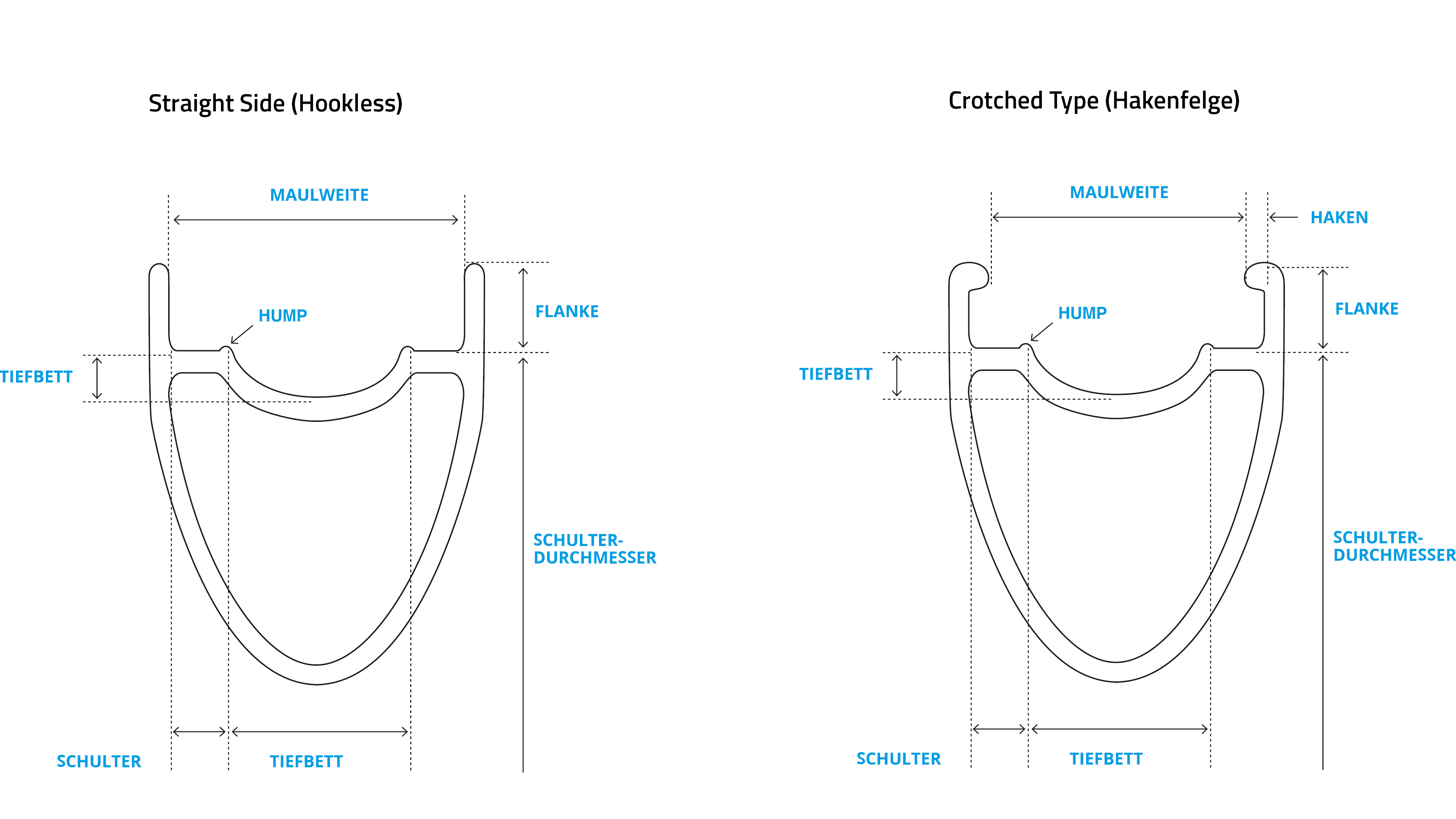- Hookless-Felgen auch „Straight Side“ genannt, sind dadurch gekennzeichnet, dass der kleine Haken am Ende der Felgenflanke fehlt.