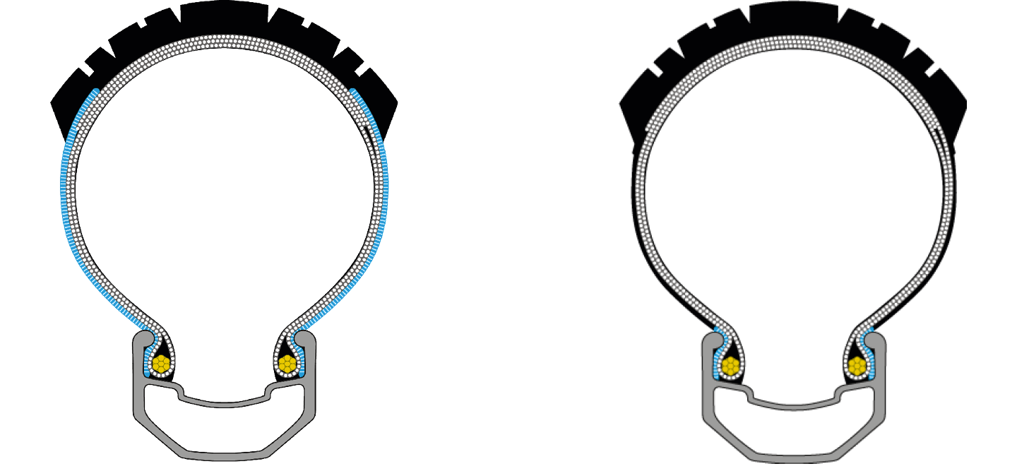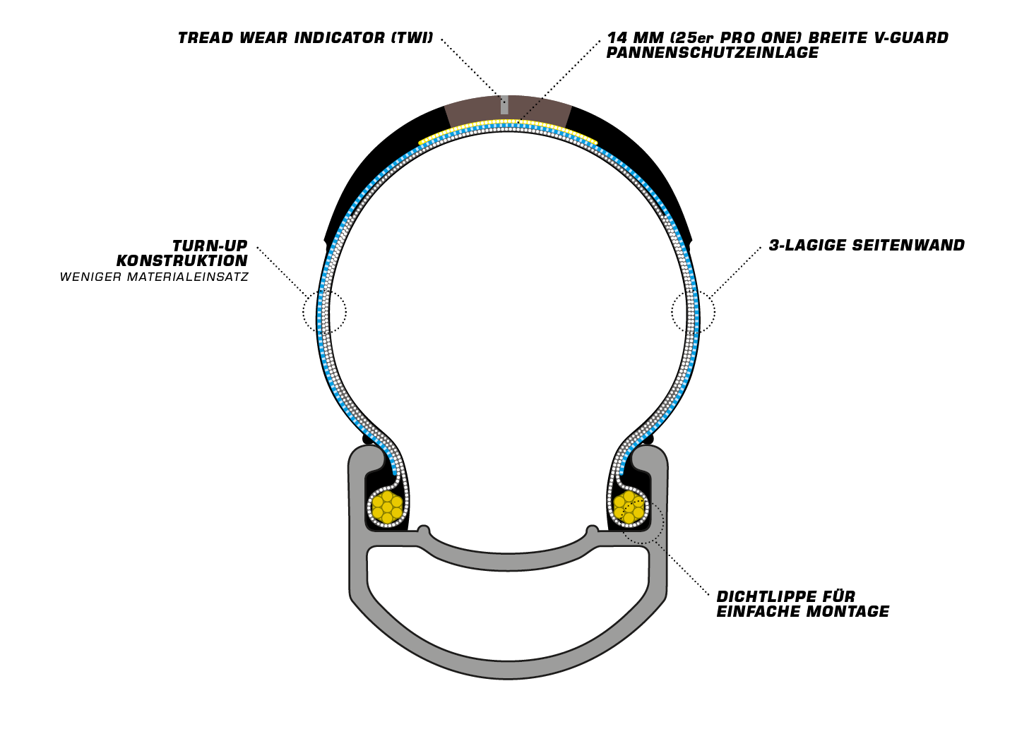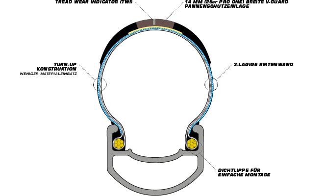 - Extrastabiler Reifenkern, mit Gummi verstärkte Seitenwand.