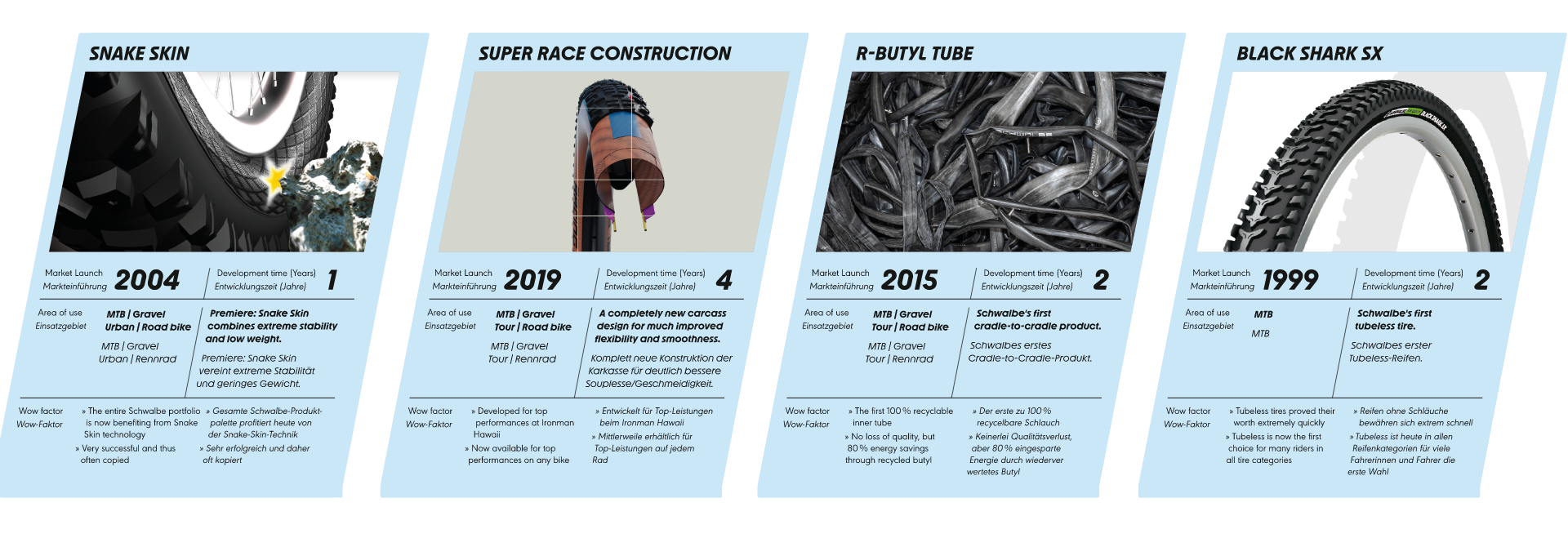 Im Schwalbe Lab feilen wir gemeinsam mit Athletinnen und Athleten an neuen Technologien. Voller Zuversicht, daraus die Ideen für das Produktsortiment der Zukunft zu schaffen. Schwalbe Lab-Produkte sind Taktgeber der Innovation. So haben wir zum Beispiel in gemeinsamer Arbeit mit den Profis im Schwalbe LAB den schnellsten Downhill-Reifen der Welt entwickelt: Tacky Chan. 2017 gewann Patrick Lange als erster den Ironman ohne Schlauch im Reifen. Dank unserem Tubeless-Setup für maximale Leistungen auf dem Rennrad.