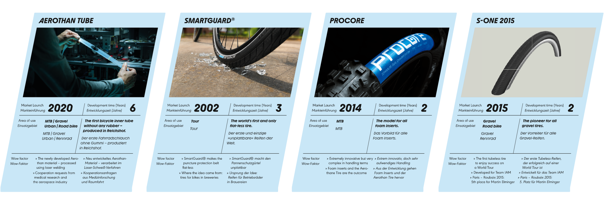 Durch die stetige Entwicklung neuer Produkte und Technologien wurde in vielen Bereichen des Fahrradsports und der Industrie Geschichte geschrieben. Hier sind einige Ausschnitte: